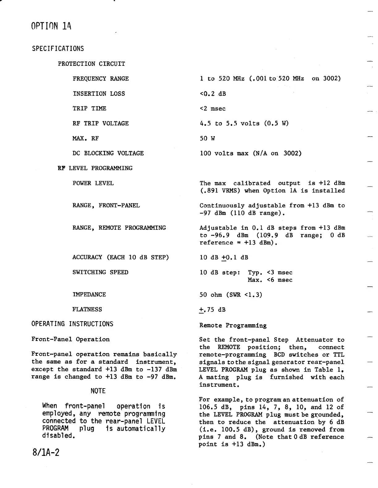 Wavetek 3000 - Option 1 A Specifications; Option 1 A Operating Instructions