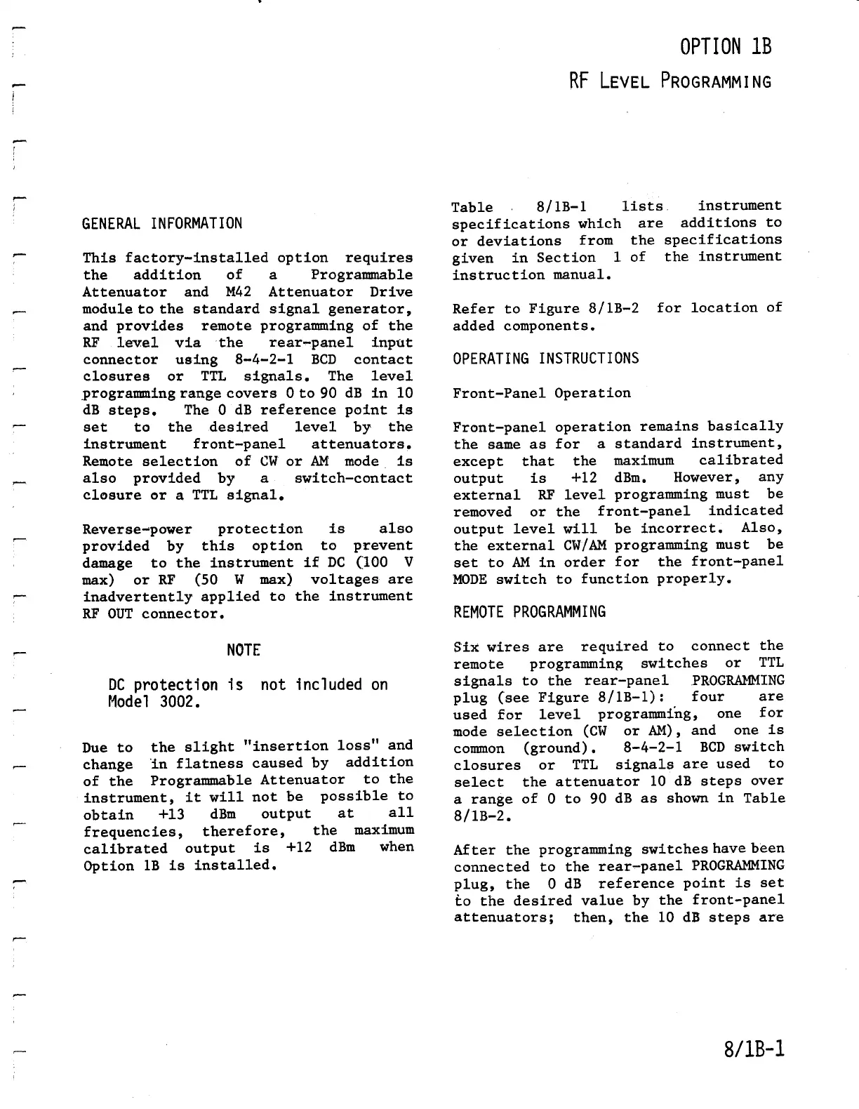 Wavetek 3000 - OPTION 1 B RF LEVEL PROGRAMMING; General Information for Option 1 B; Option 1 B Operating Instructions