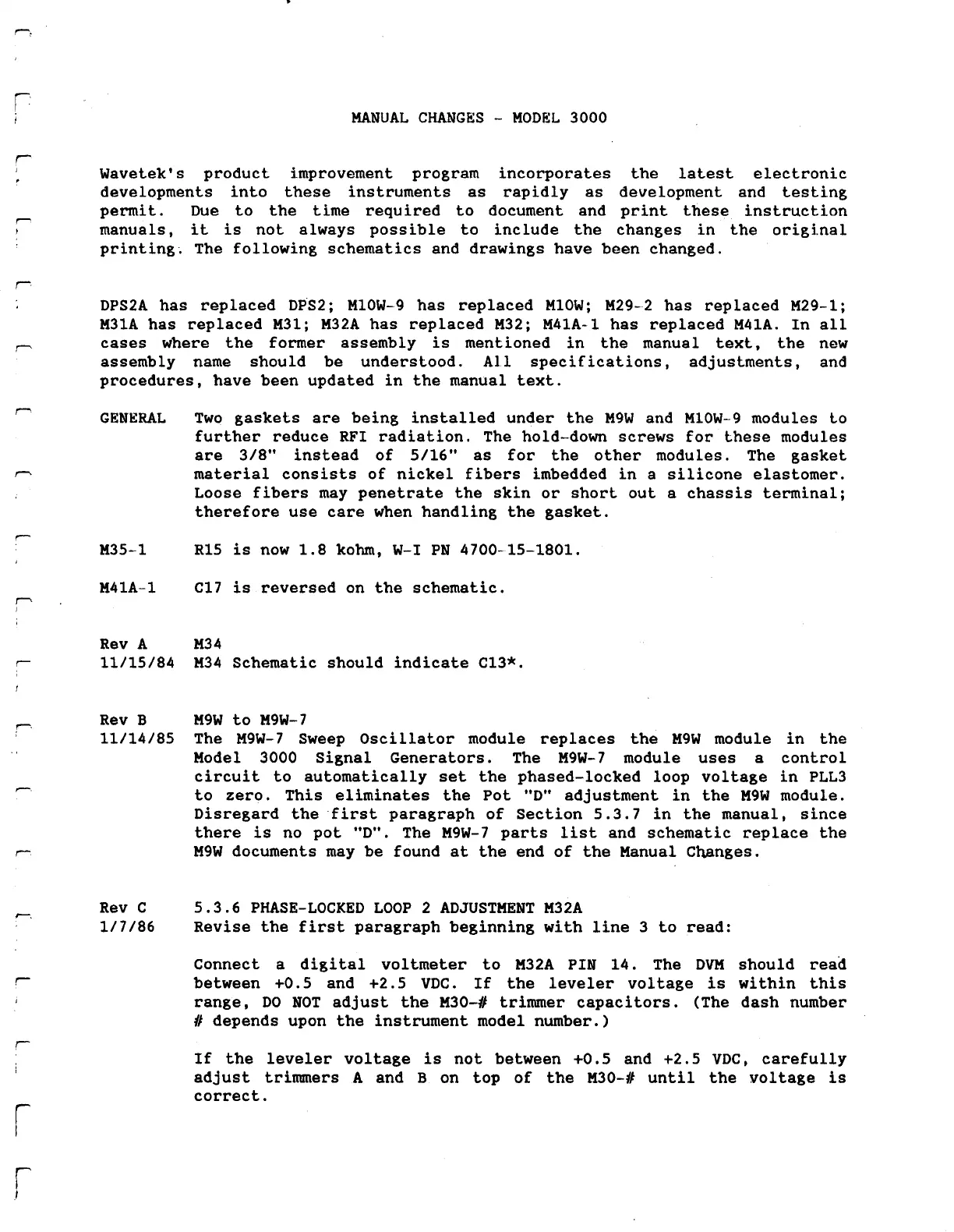 Wavetek 3000 - MANUAL CHANGES - MODEL 3000; General Information on Manual Changes; Module Replacements and Revisions; General Notes on Gaskets