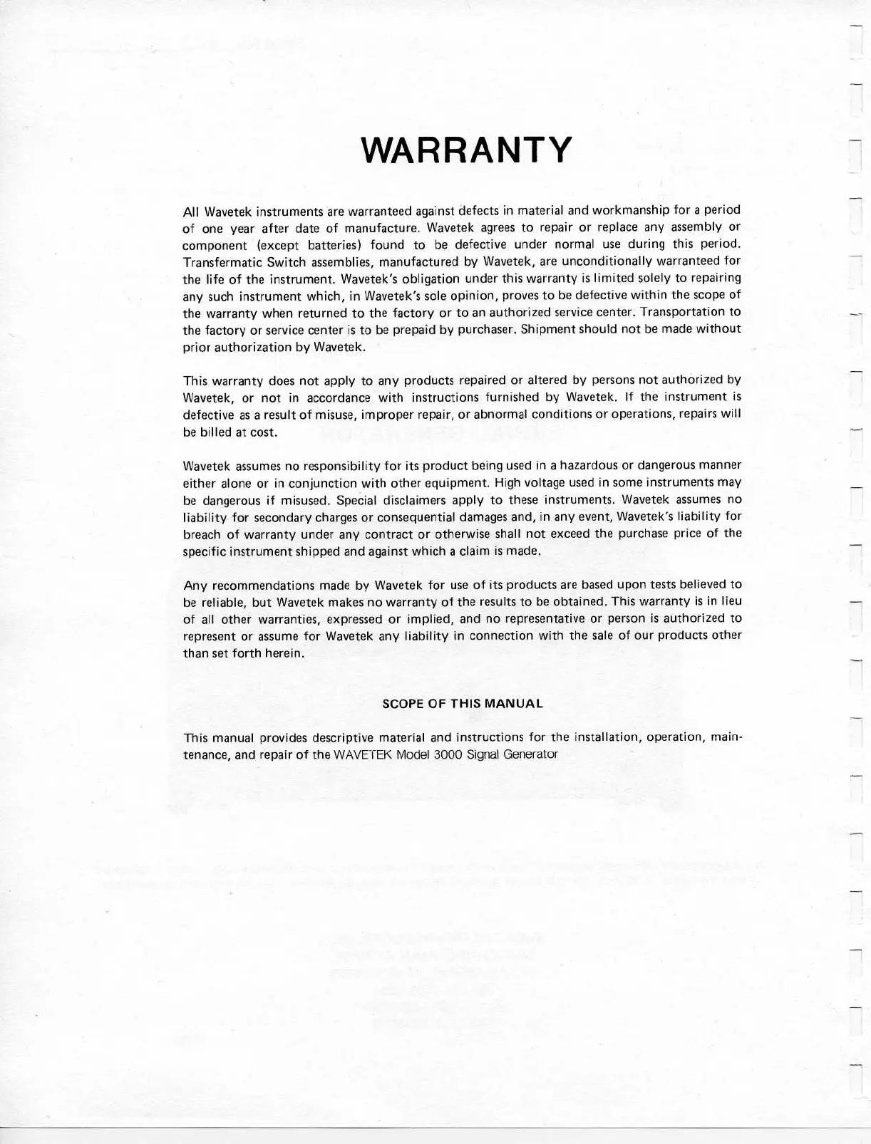 Wavetek 3000 - WARRANTY; Scope of Manual