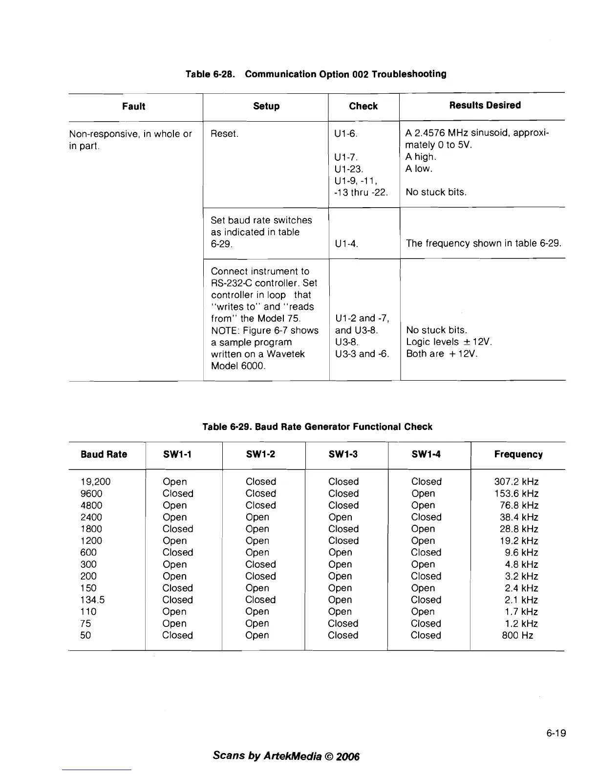 Wavetek 75 - Communication Option 002 Troubleshooting; Baud Rate Generator Functional Check