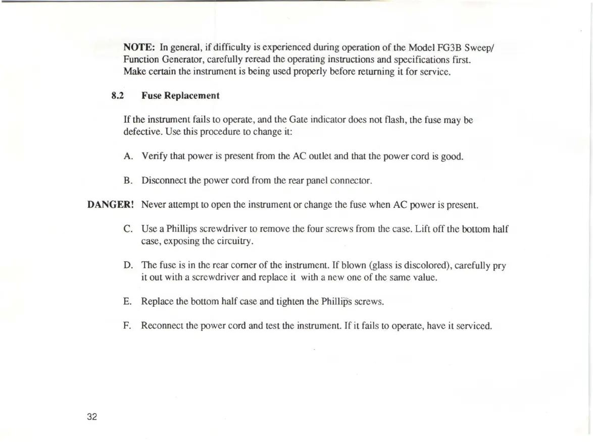 the instrument fails to opera te, and the Gate indicator does not flash, the fuse may be