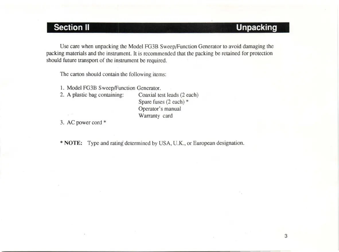 Use care when unpacking the Model FG3B Sweep/Function Generator