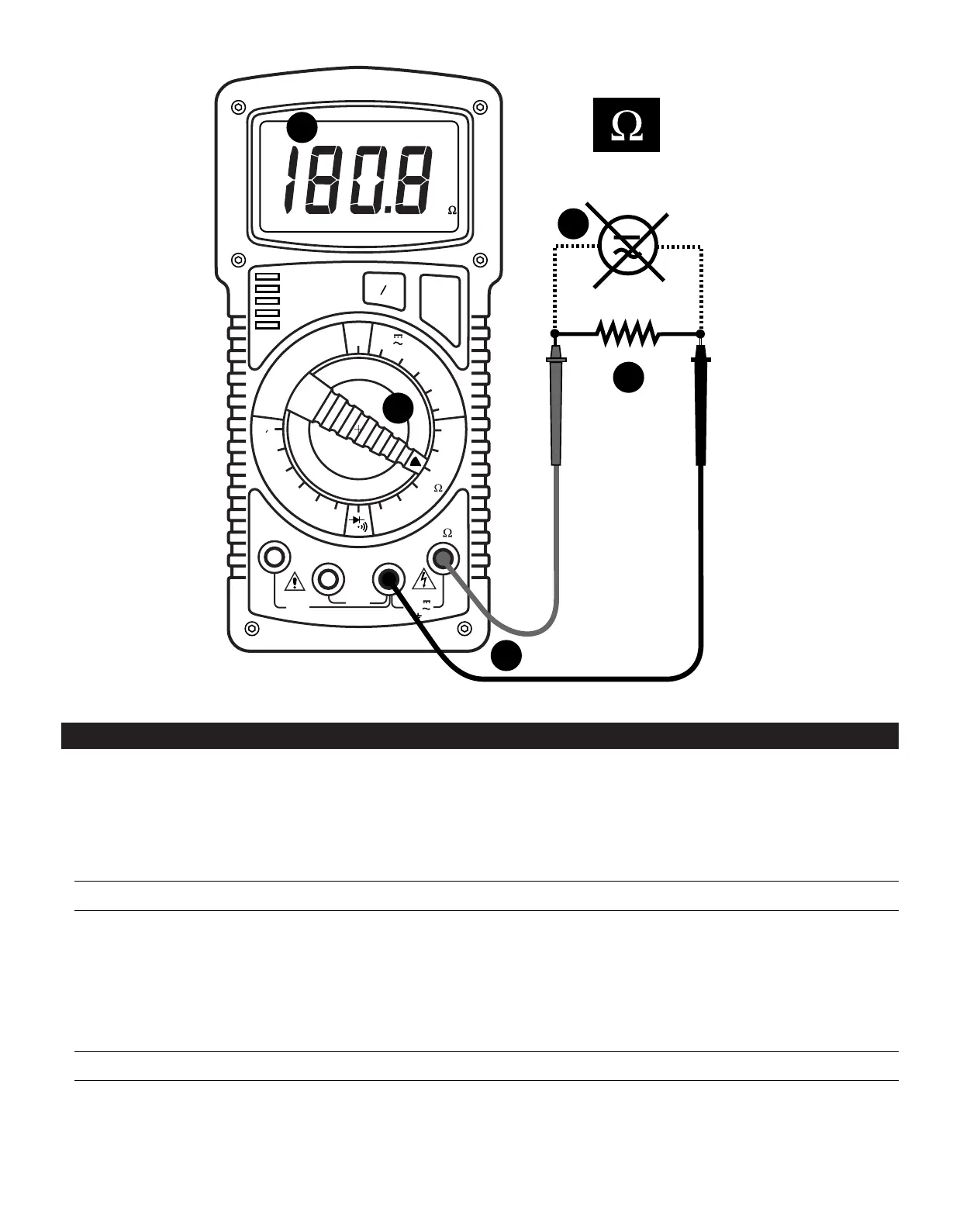 measured. ➎ Read resistance value on Digital Display. Open circuits will be displayed as “1”.