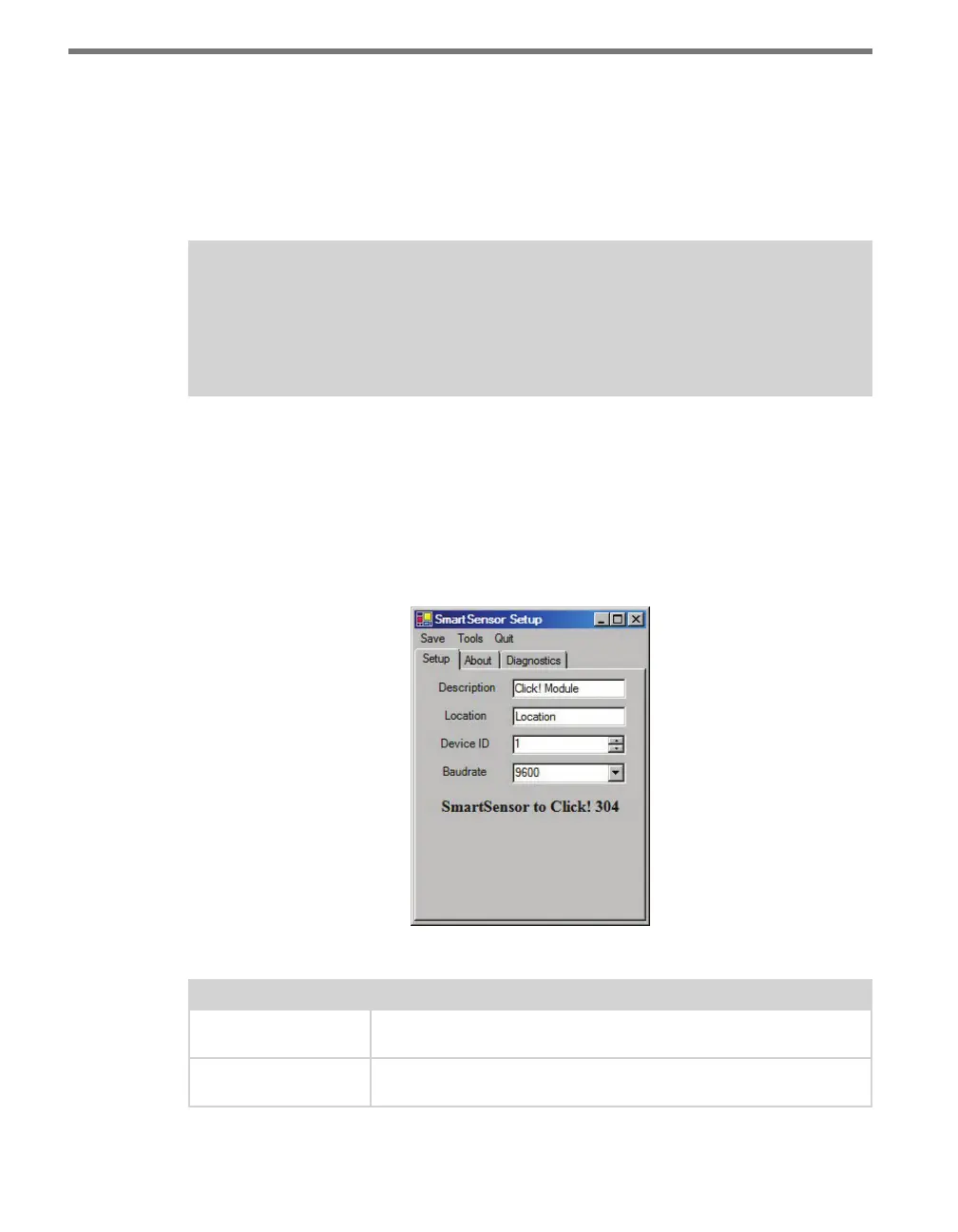 e SmartSensor driver contains three tabs: Setup, About and Diagnostics. e Setup tab