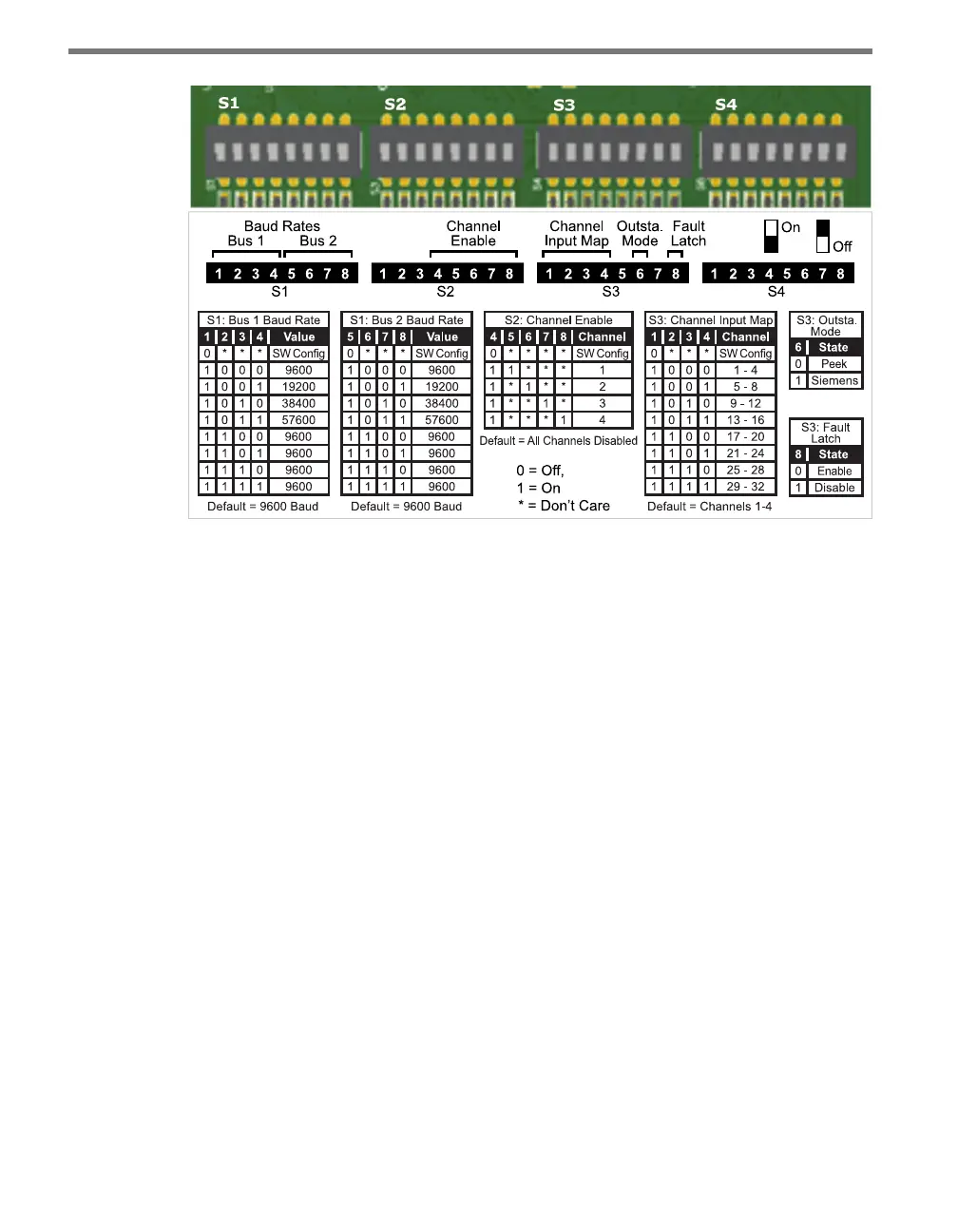 ture above. (e fourth switch, labeled S4, is currently not used.) Each DIP switch is used to
