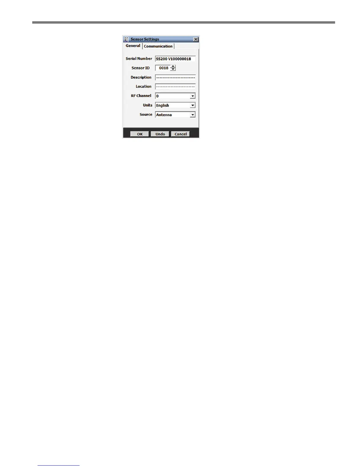 e Communication tab is used to specify baud rate and response delay for the sensor’s