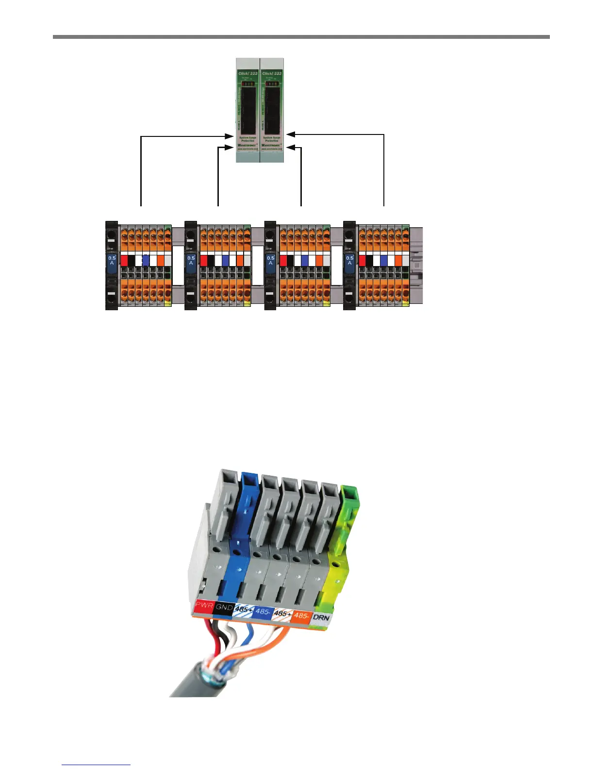Each 6-conductor cable has one DC power wire pair, two RS-485 communication pairs, and
