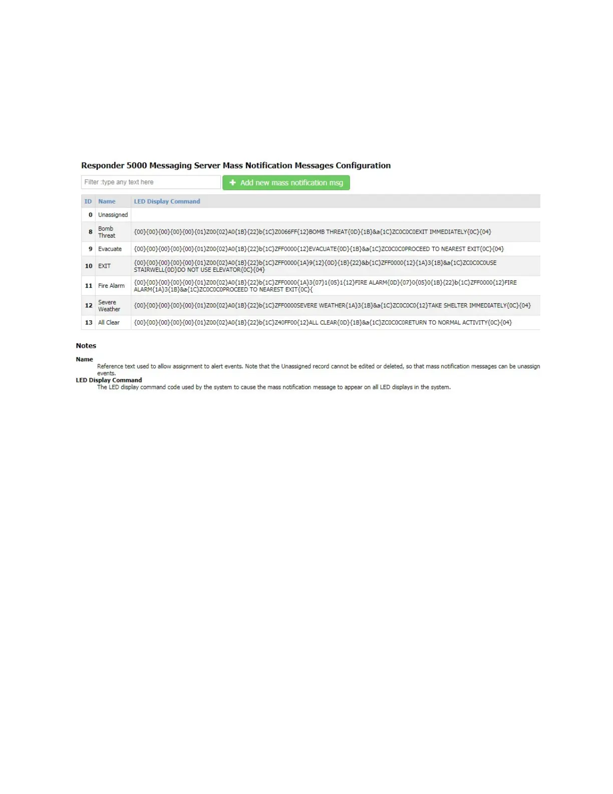 The Mass Notification Msgs page allows configuration of priority messages that can appear on LED