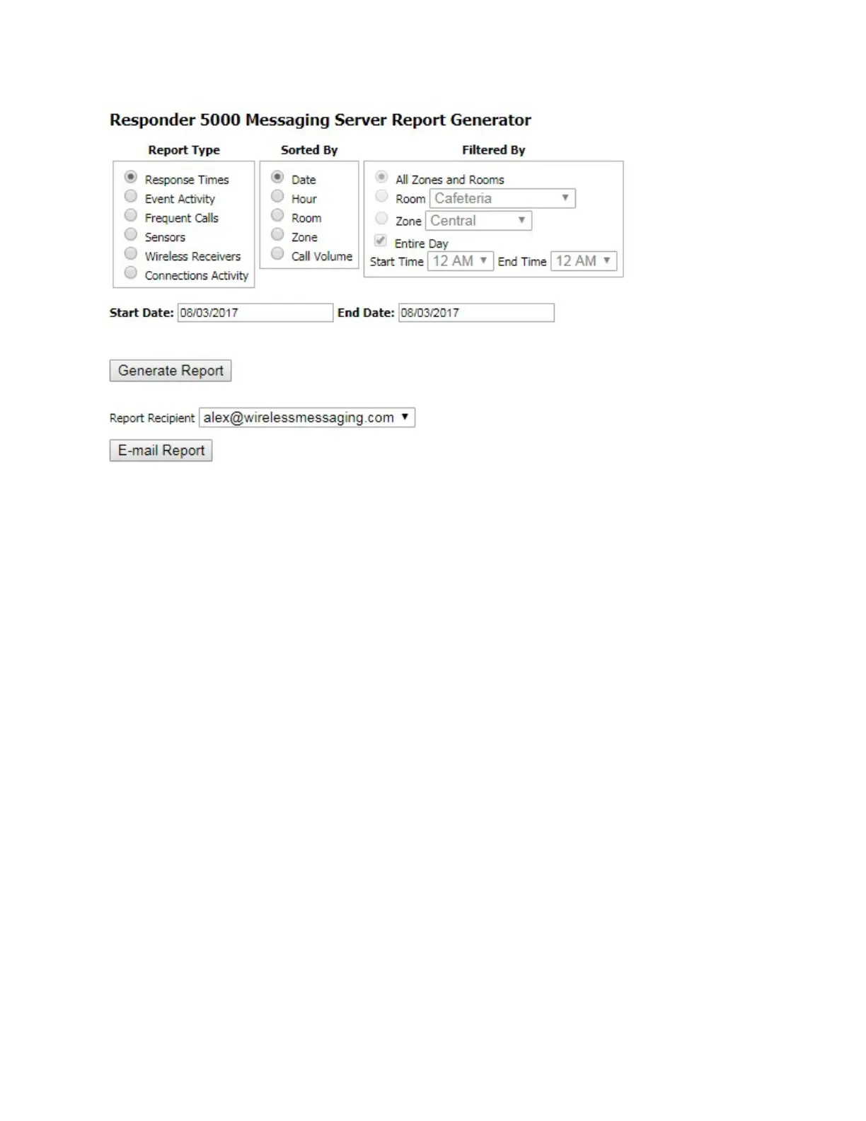 When Response Times report is selected, you can select sorting by Date, Hour, Room, Zone, or Call Volume, with the