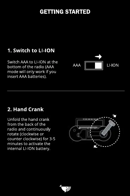 Wayl buzz4000 - GETTING STARTED; Switch to LI-ION Power; Hand Crank Charging