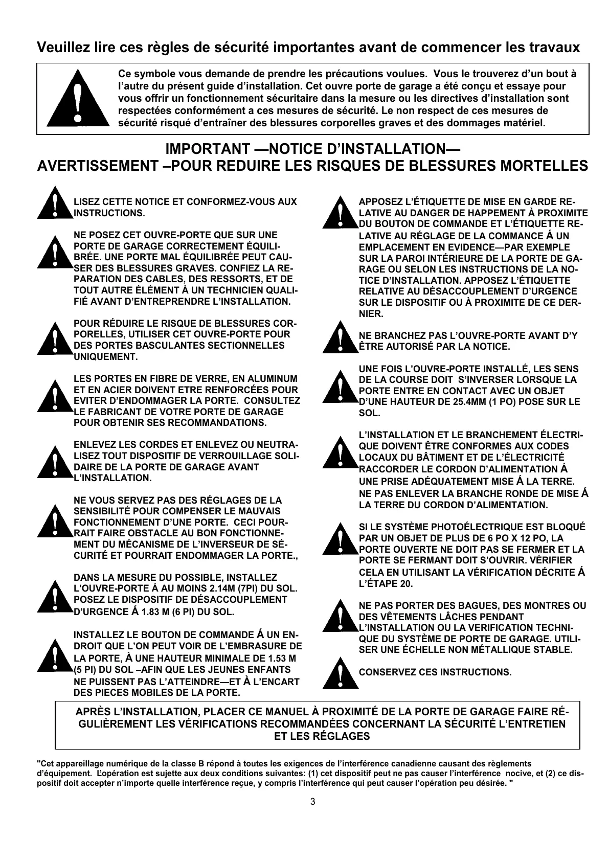APRÈS L’INSTALLATION, PLACER CE MANUEL À PROXIMITÉ DE LA PORTE DE GARAGE FAIRE RÉ-