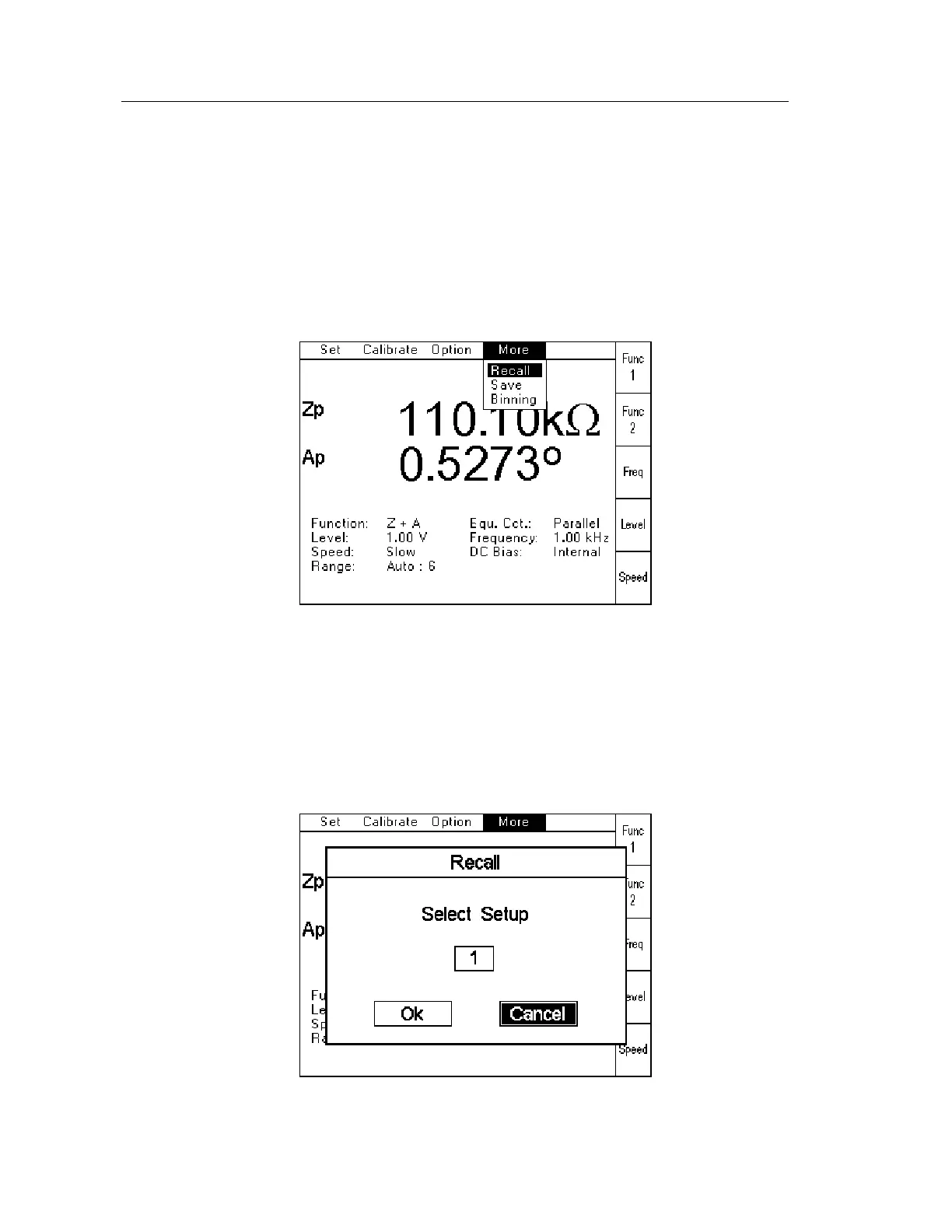 Recall allows a previously stored measurement setup (see Save below) to be recalled and used.