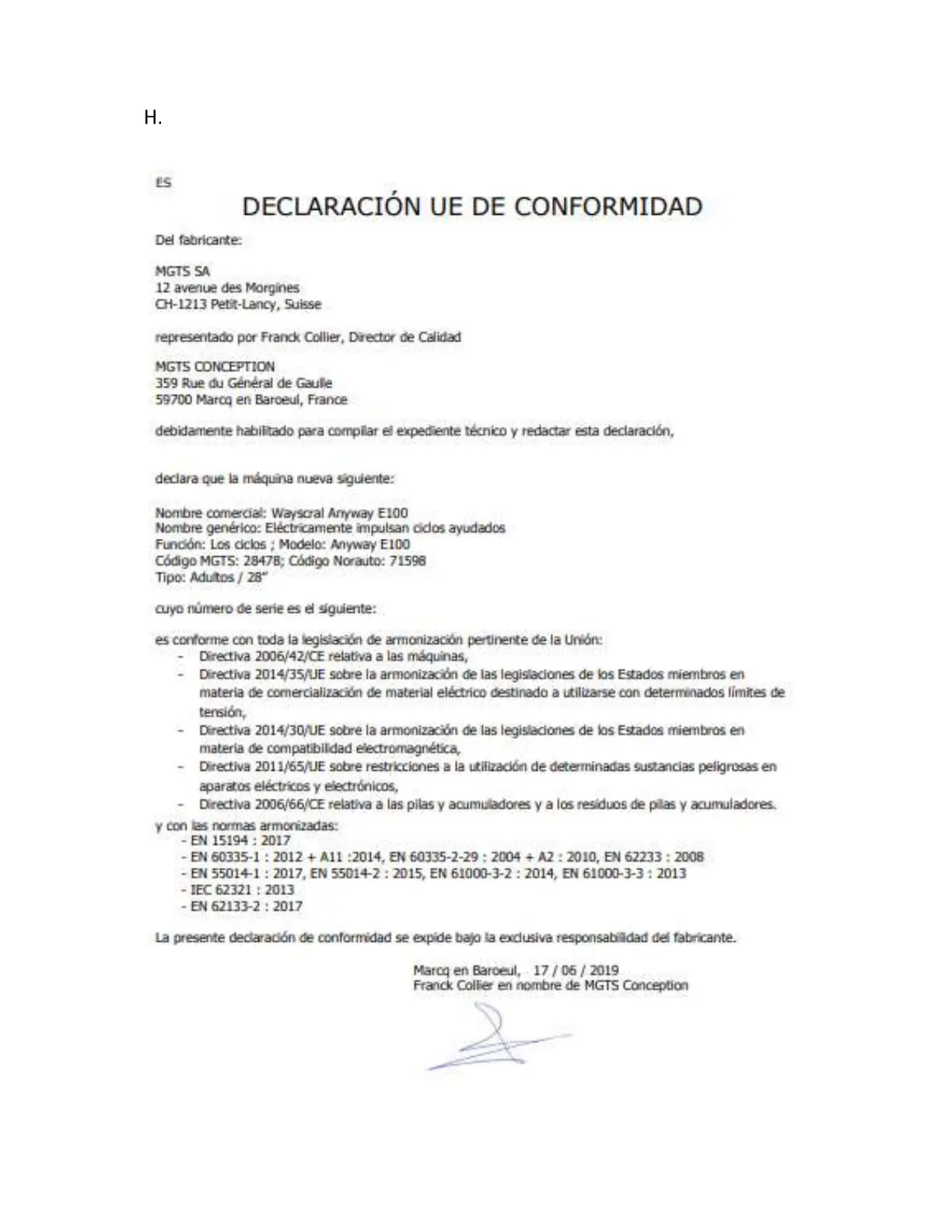 wayscral ANYWAY E-100 - Declaración de Conformidad UE