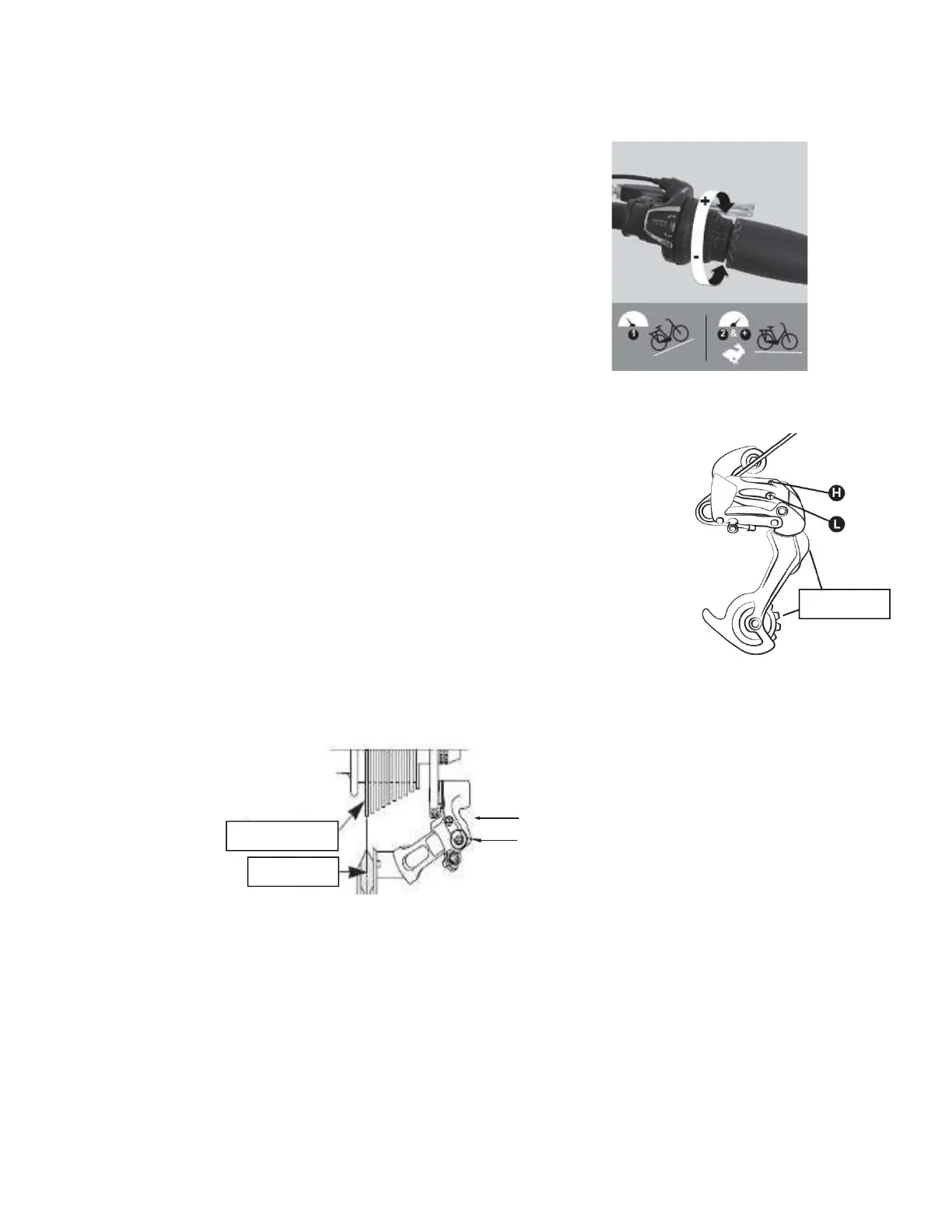De loop van de derailleur wordt geregeld met de schroeven H en L.