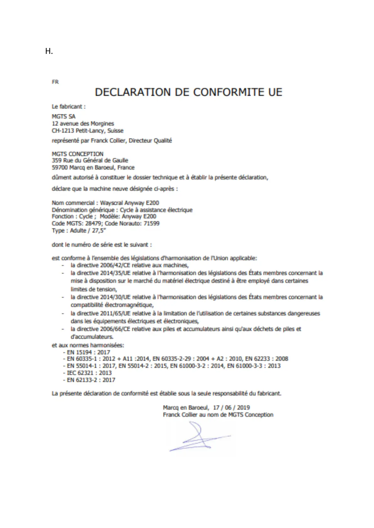 wayscral ANYWAY E-200 - Déclaration de Conformité UE