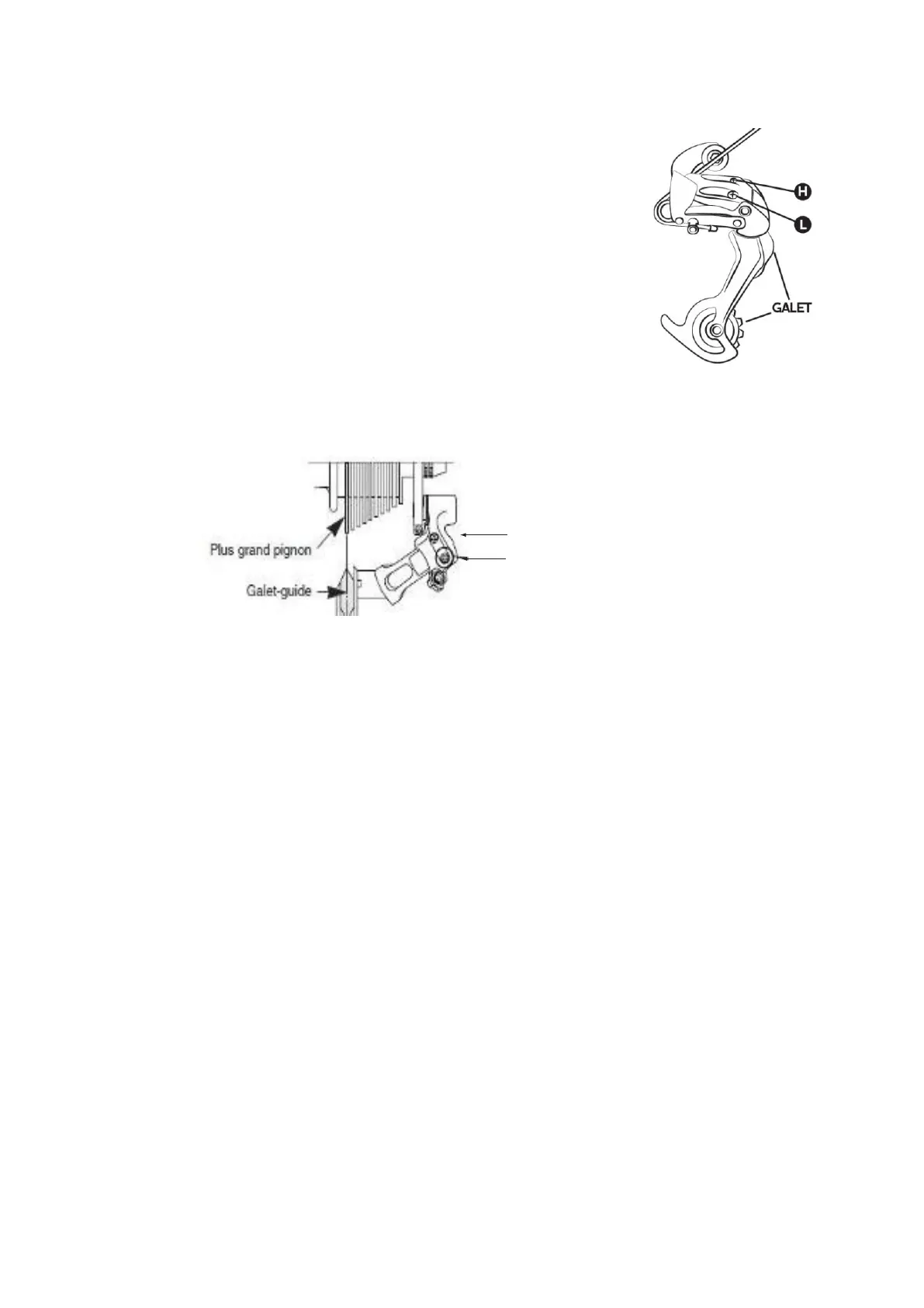 Șurubul H permite reglarea opritorului inferior (partea pinionului mic).