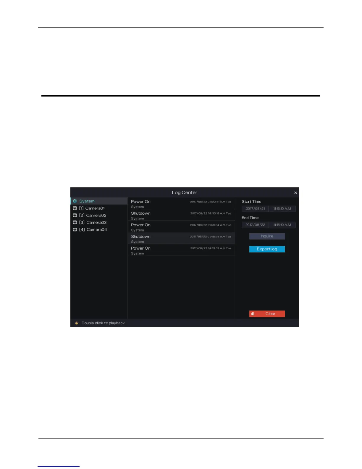 DVR in Log Center, including power-on, parameter settings, and camera management.
