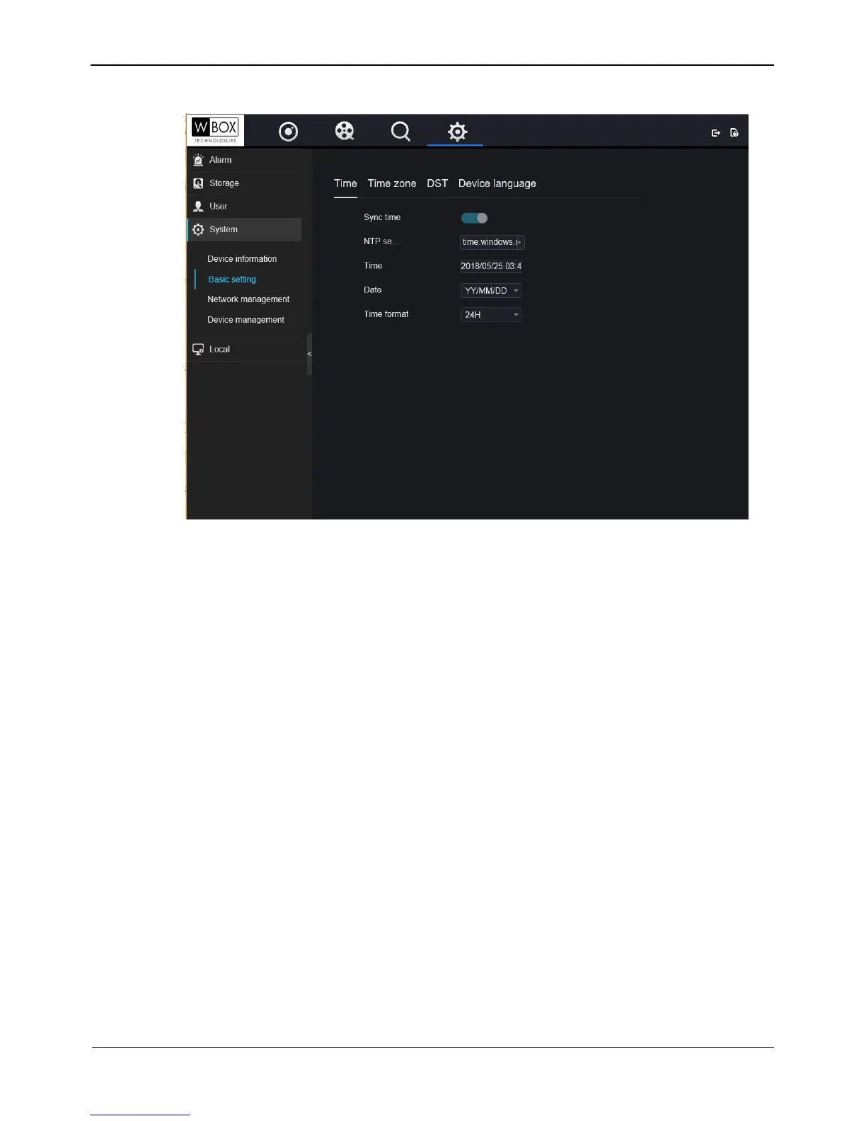 Step 2 Click Time, Time zone, DST, Device language to view these basic information..
