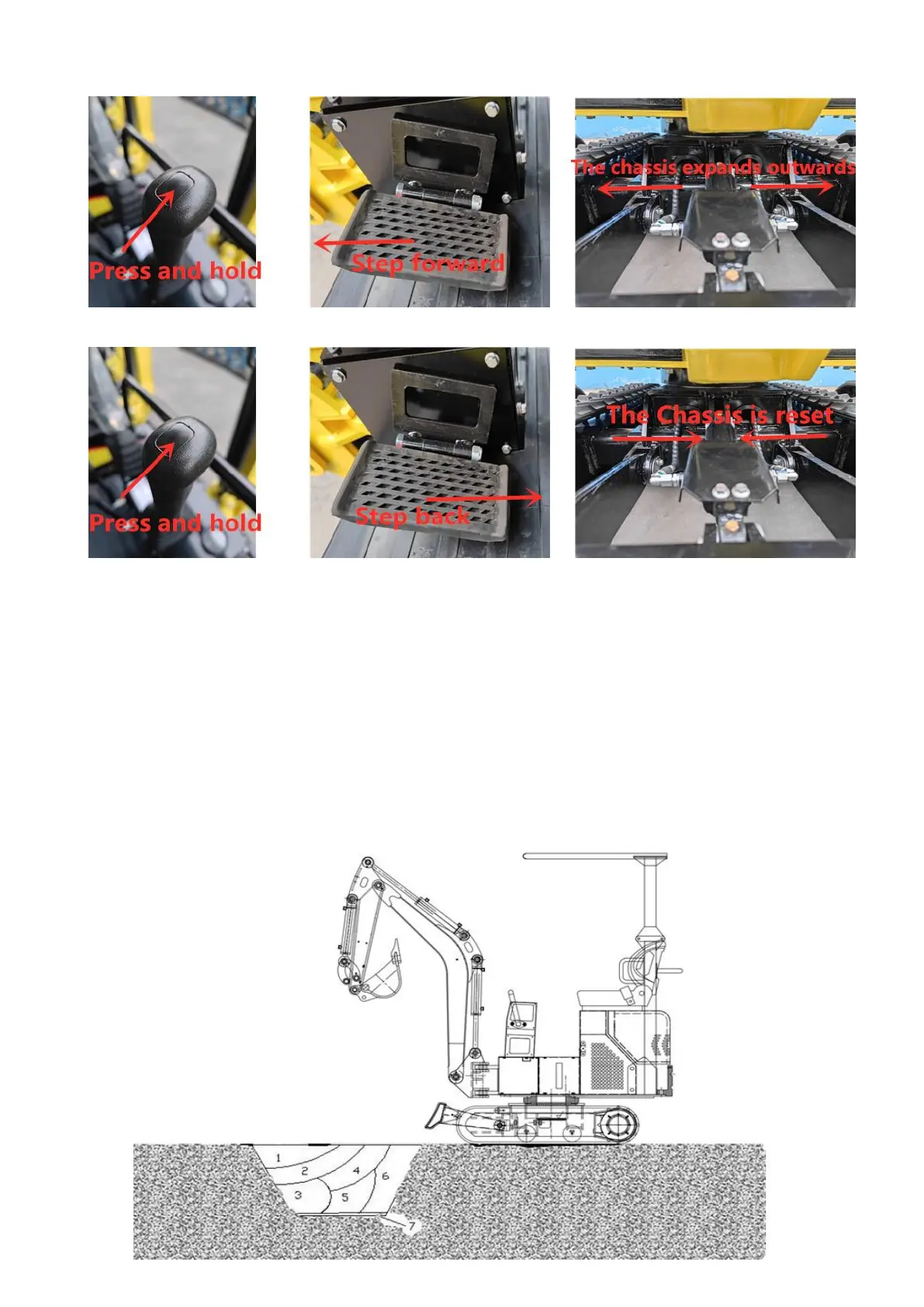 2. Press and hold the expandable track button, place your foot on the assist pedal and step back, the chassis