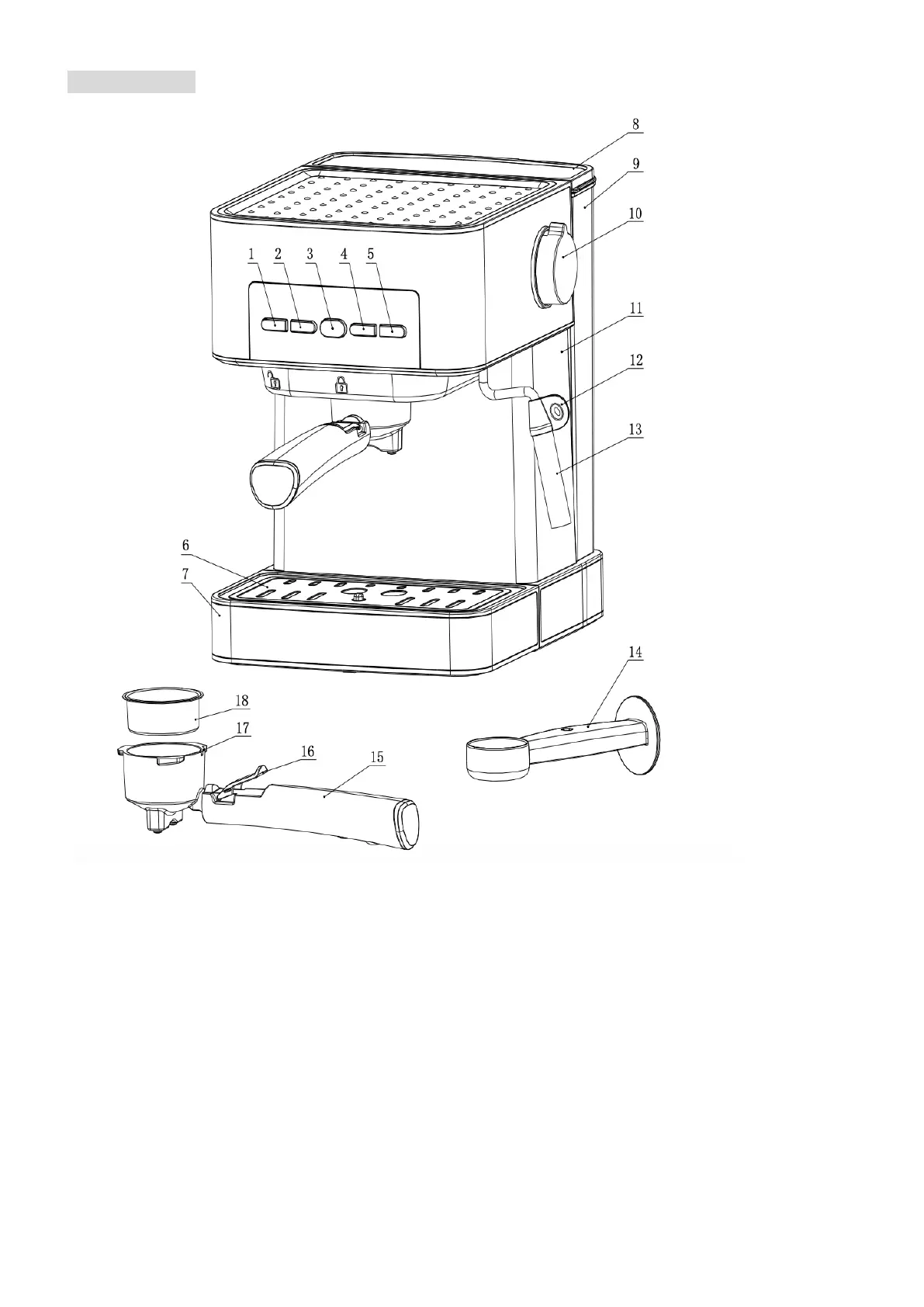 12. Élément du tuyau vapeur 13. Embout vapeur 14. Dosette 15. Manche du porte-filtre