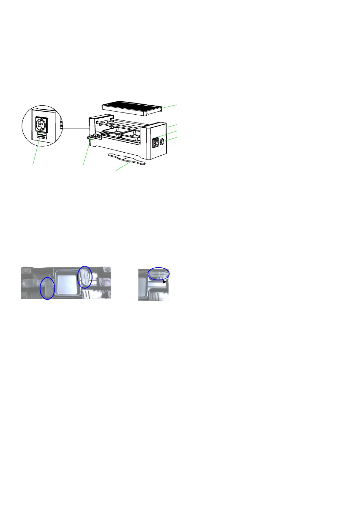Die beiden mitgelieferten Raclette- Pfannen werden auf dem Boden der Grundlage befestigt.