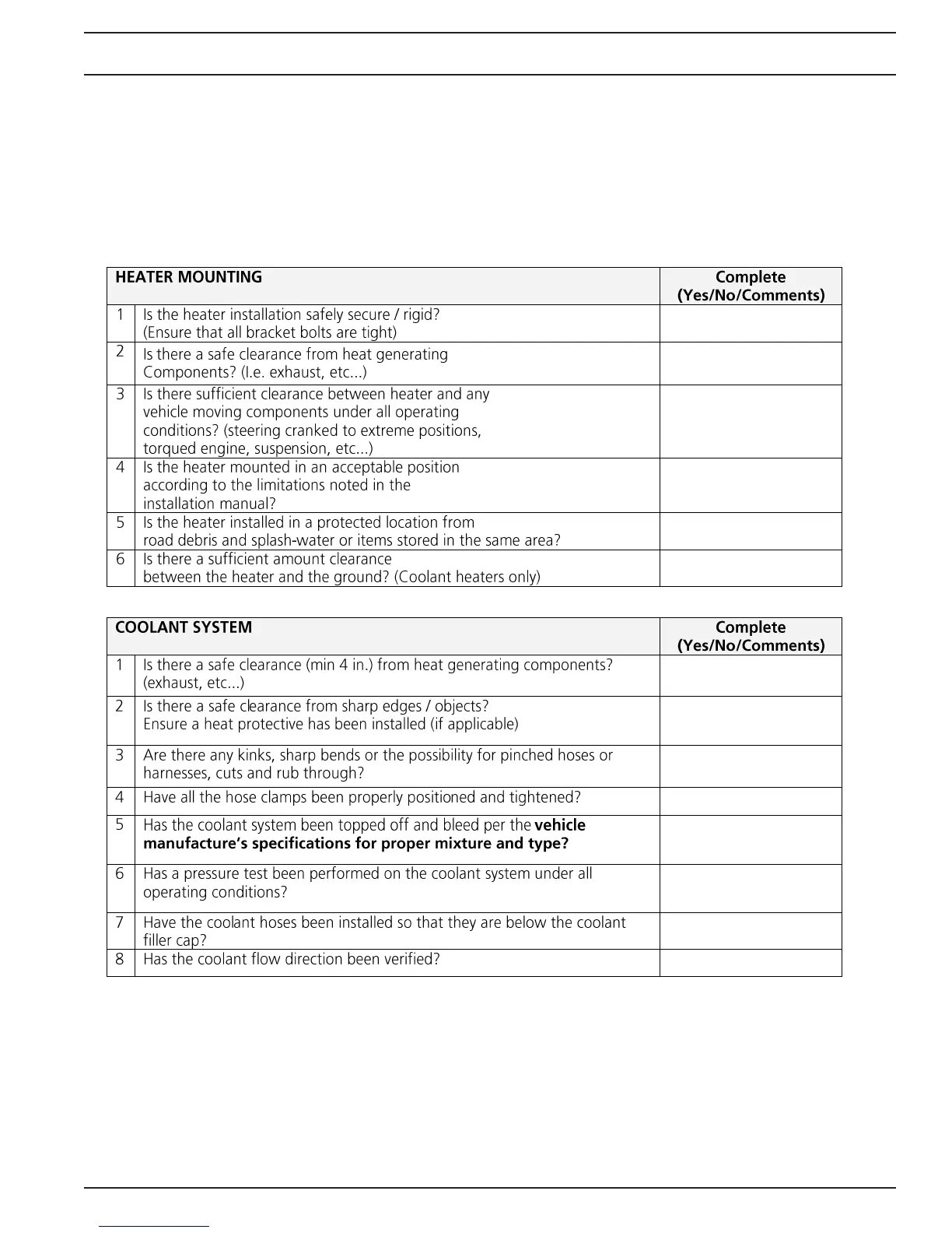 Webasto Scholastic Series - Initial Heater Operation; Pre-Operation Installation Checklist