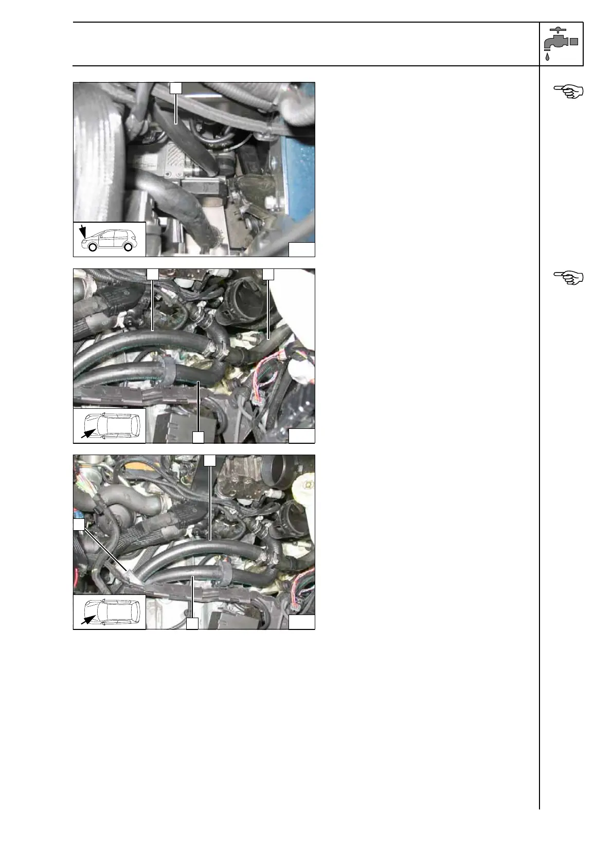 Install coolant hose B with 90° elbow on heat-