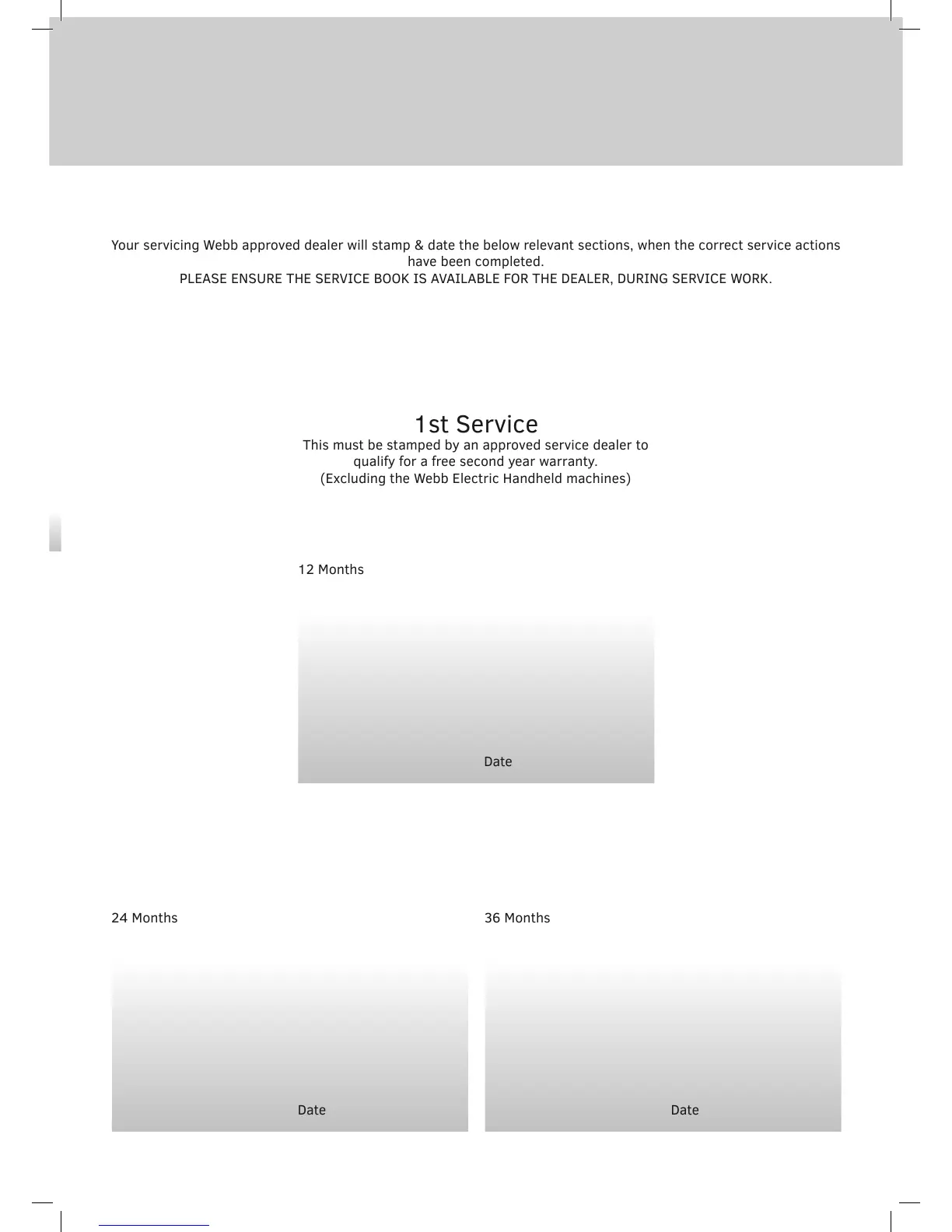 Your servicing Webb approved dealer will stamp & date the below relevant sections, when the correct service actions