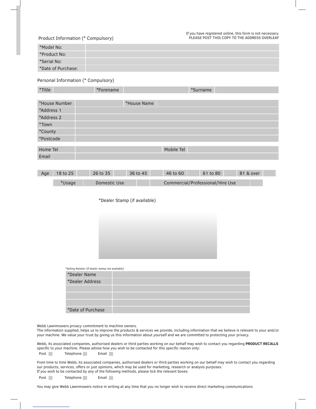 Webb, its associated companies, authorised dealers or third parties working on our behalf may wish to contact you regarding PRODUCT RECALLS