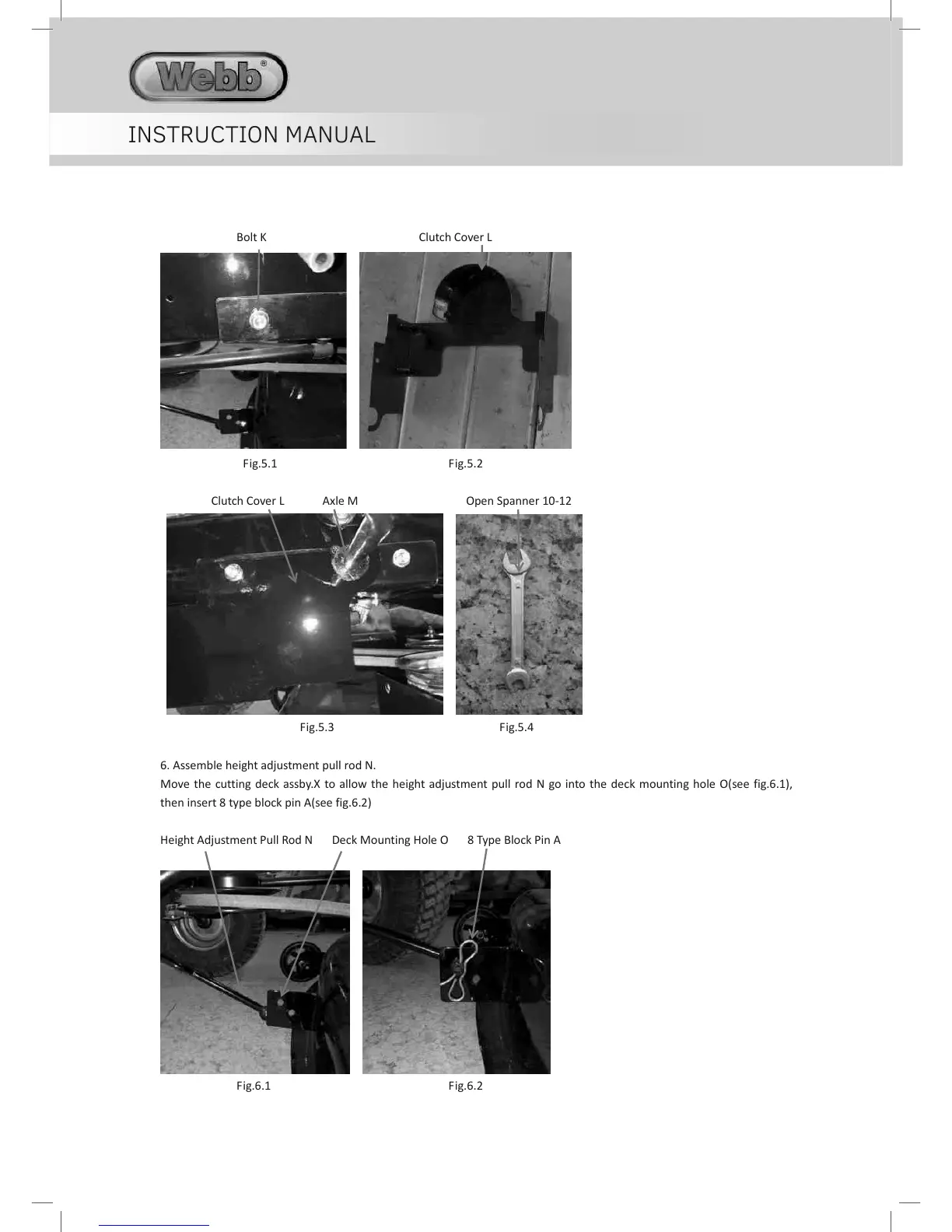 Move the cutting deck assby.X to allow the height adjustment pull rod N go into the deck mounting hole O(see fig.6.1),
