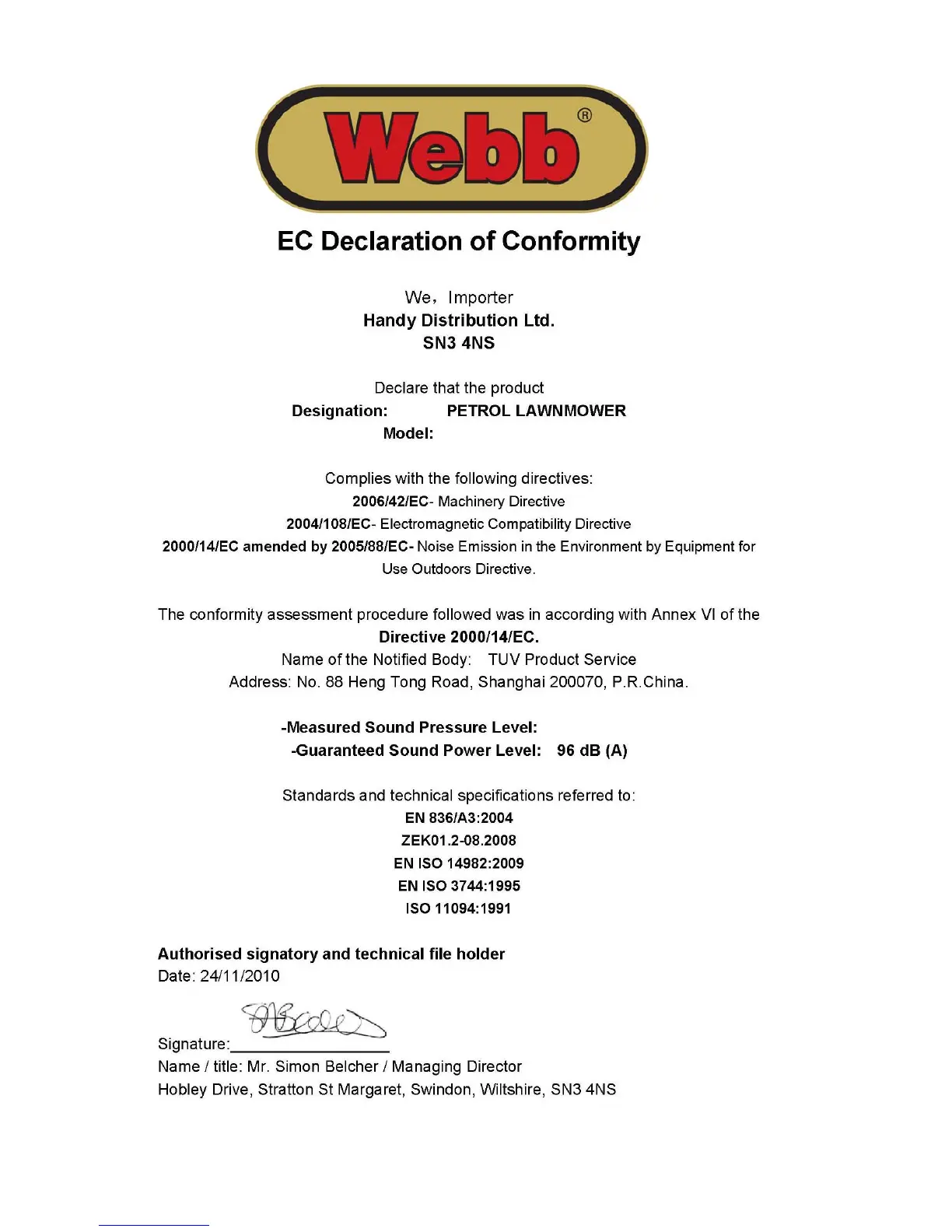 Webb WER18SP - EC Declaration of Conformity