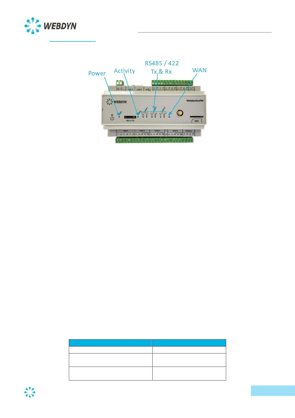 This indicator represents the power status of the WebdynSunPM concentrator. The LED is lit as soon
