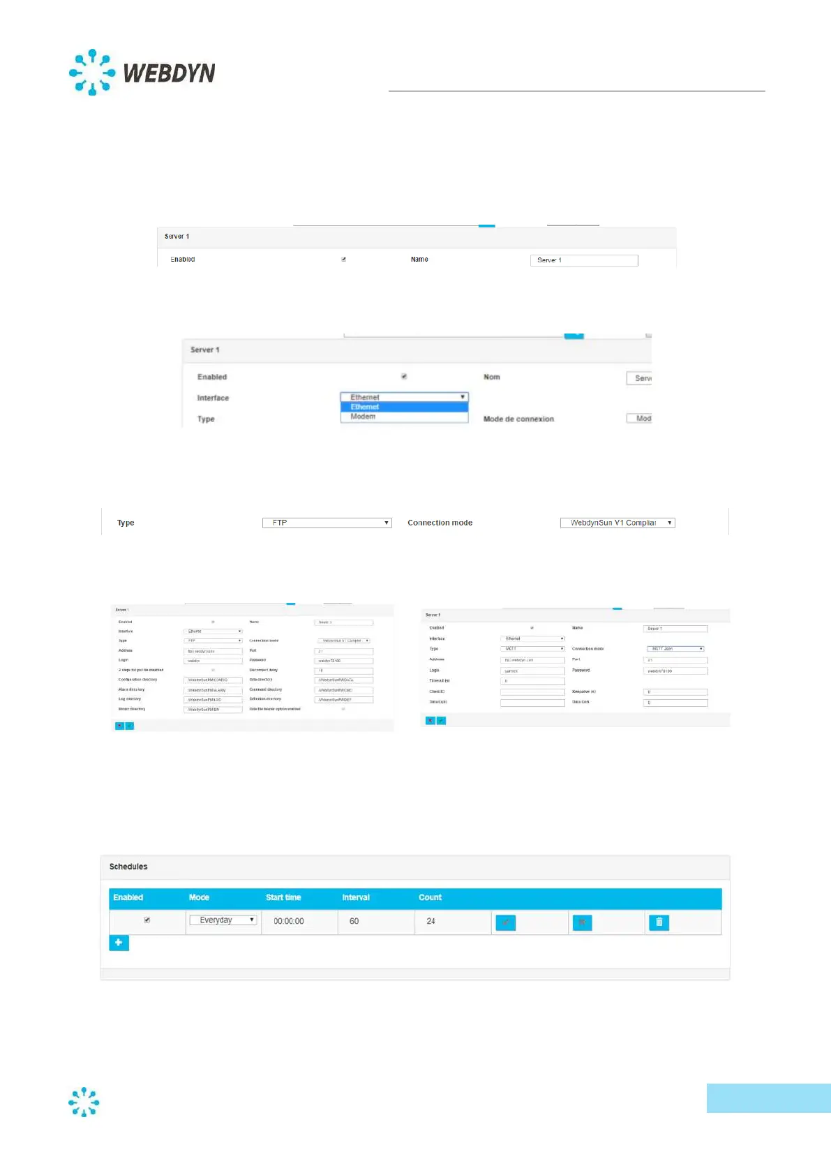 The connection mode, as well as the server settings, vary depending on the server type selected.