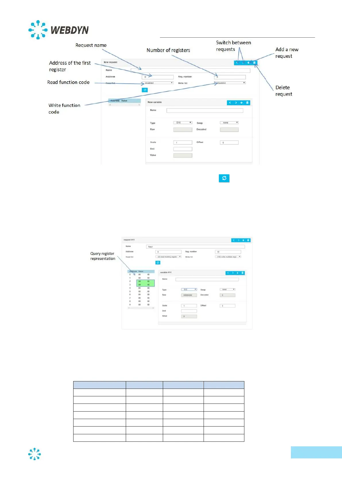 For each request from a Modbus slave, you can add, modify or delete a variable.