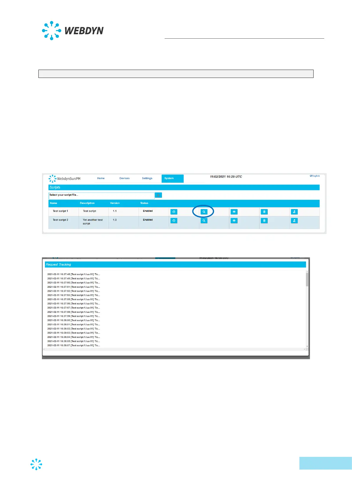 • Either directly on the local web site on the script page by clicking the view log icon (see
