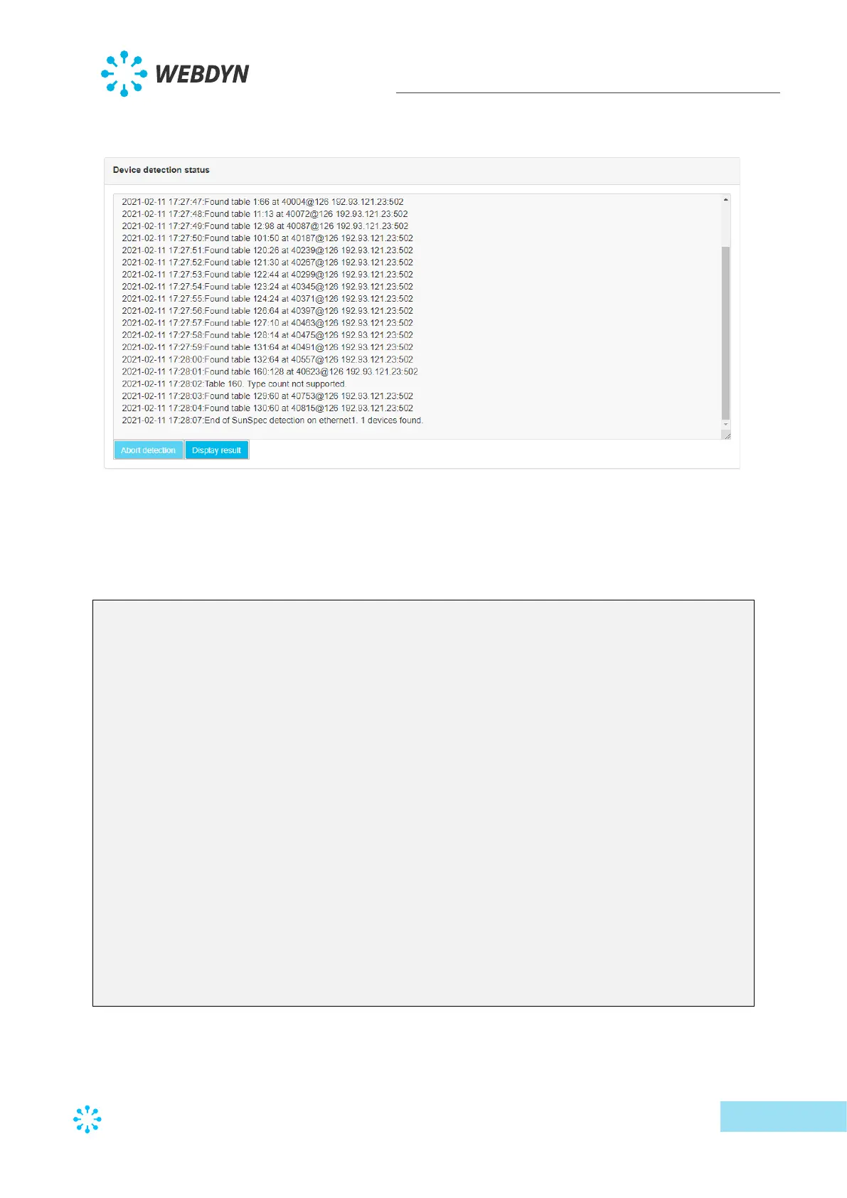 During a SunSpec detection, the detection result is displayed on the local web page as it