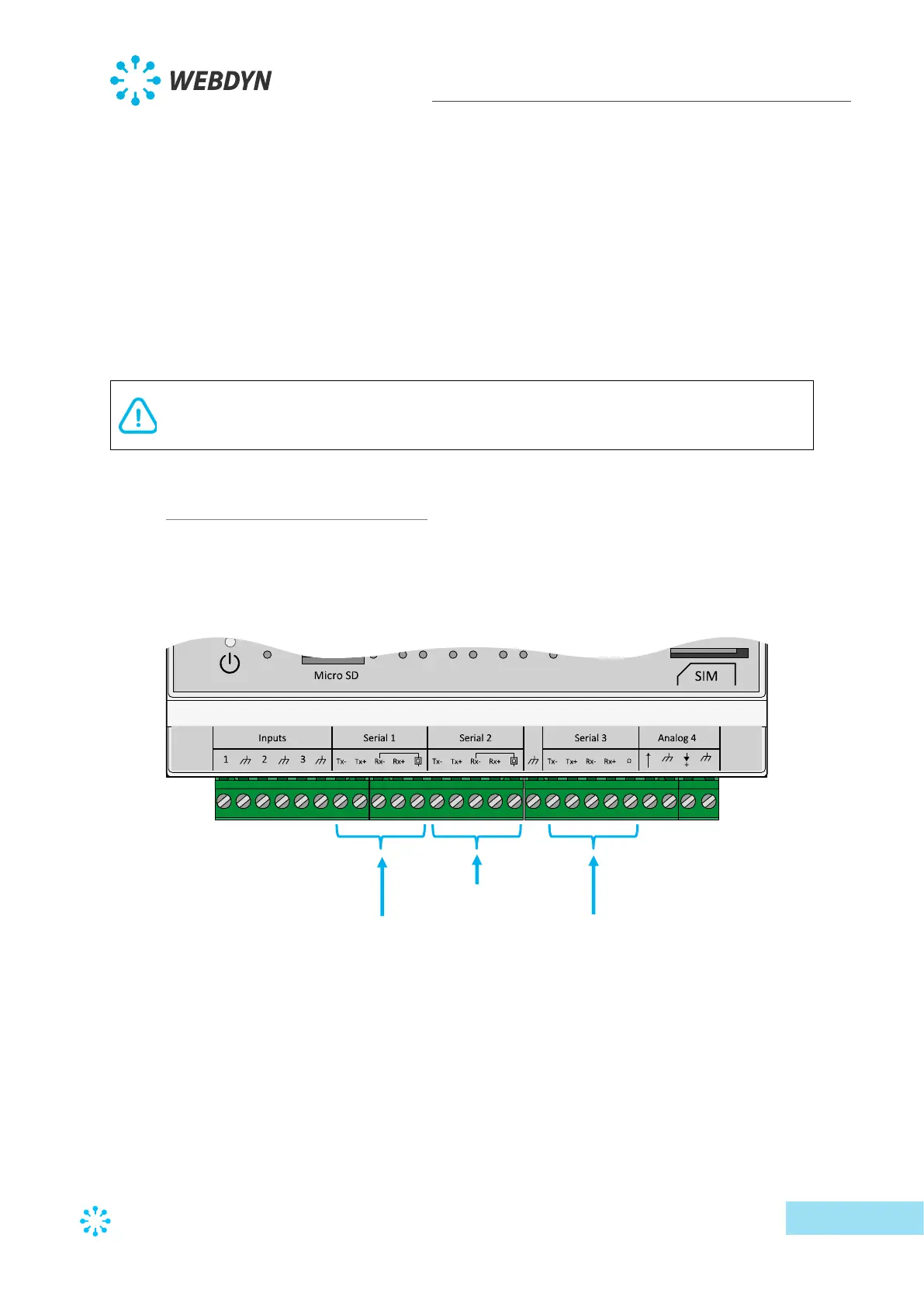 The WebdynSunPM concentrator has 3 RS485/RS422 serial ports marked “Serial” on the