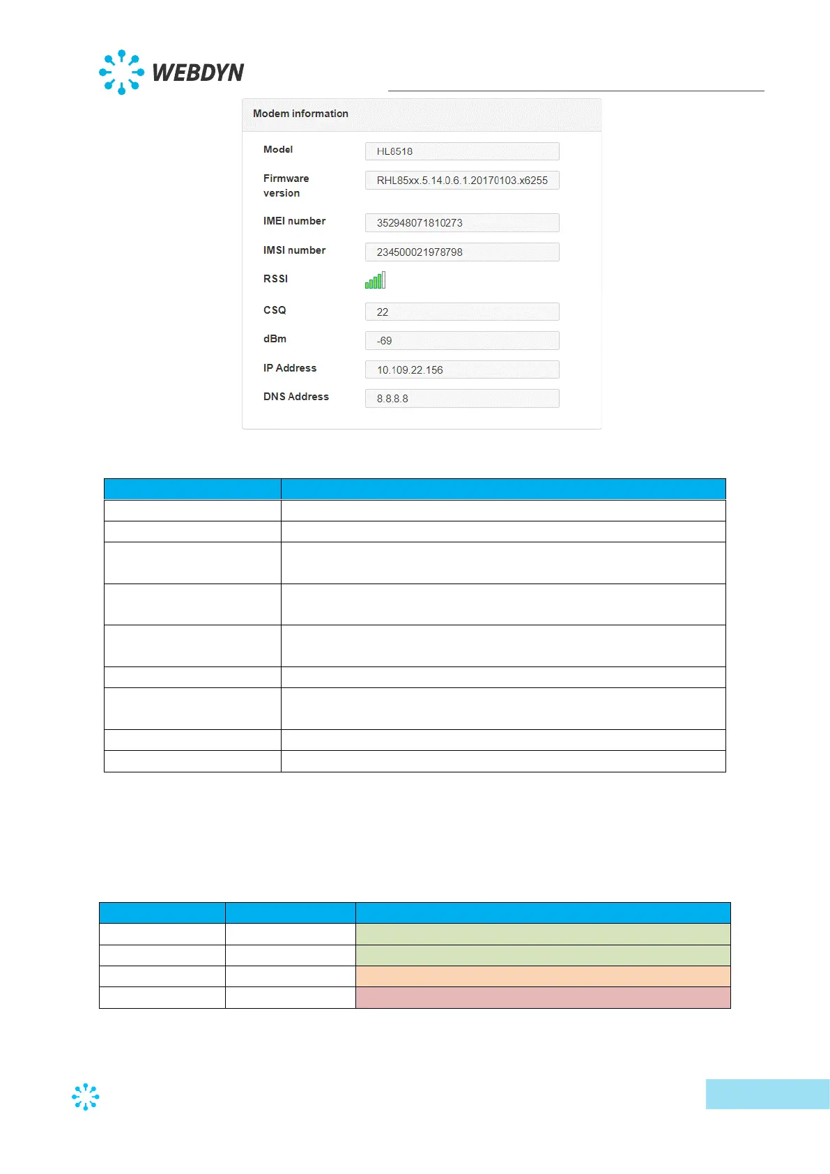 Signal level returned by the modem interpreted in dBm of -113