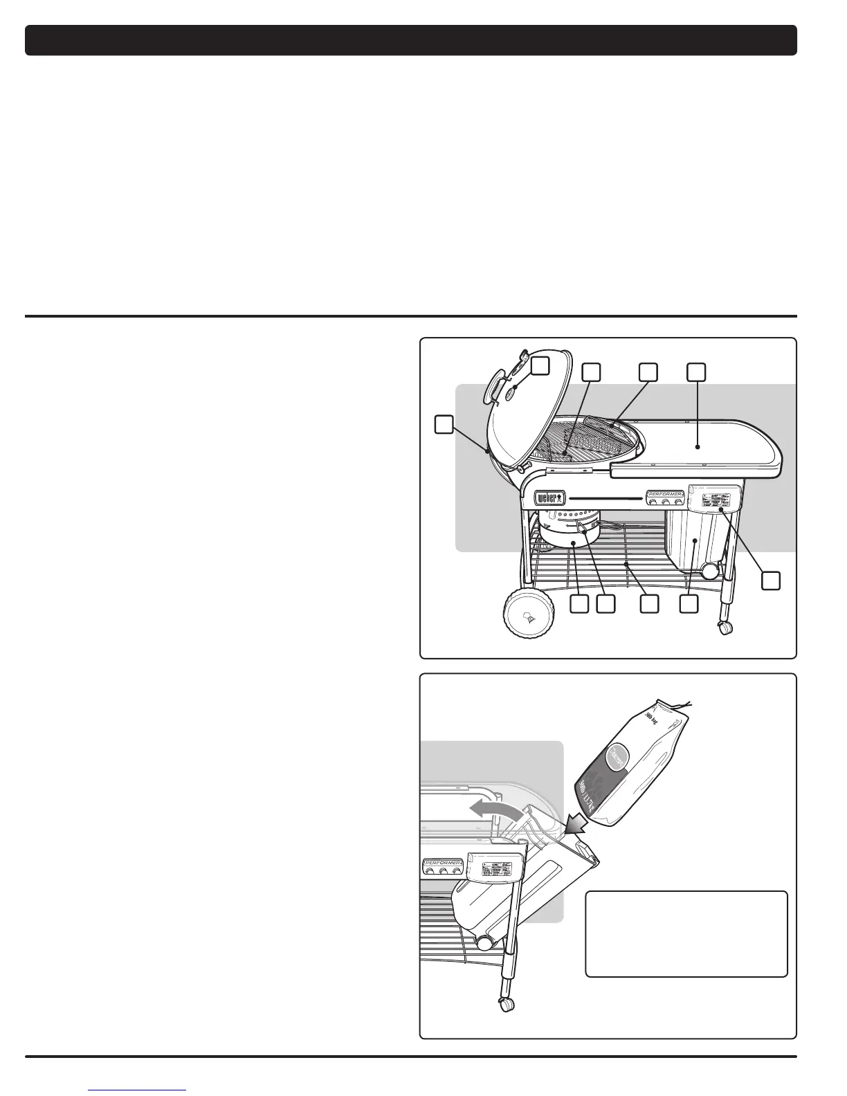 charcoal briquets (1). Simply push a button and the system’s gas burner ignites,