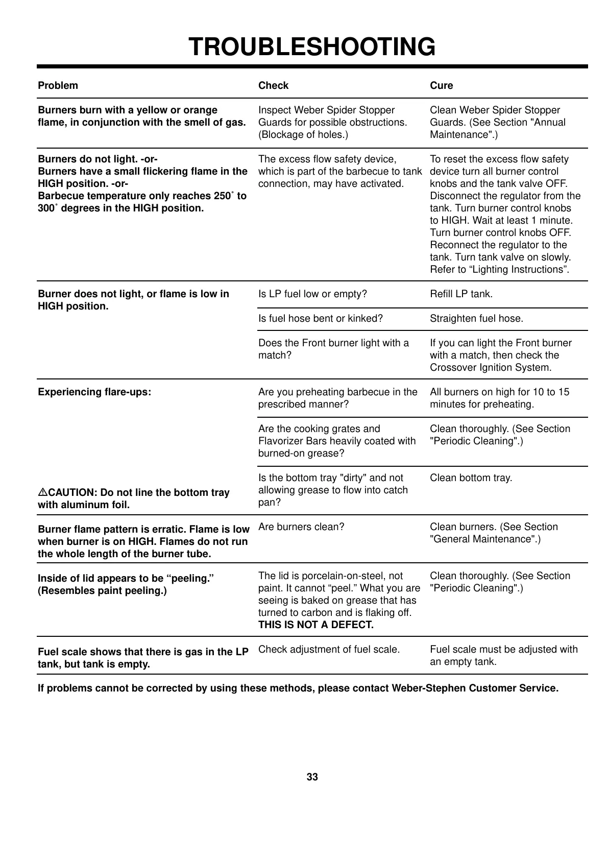 If problems cannot be corrected by using these methods, please contact Weber-Stephen Customer Service.
