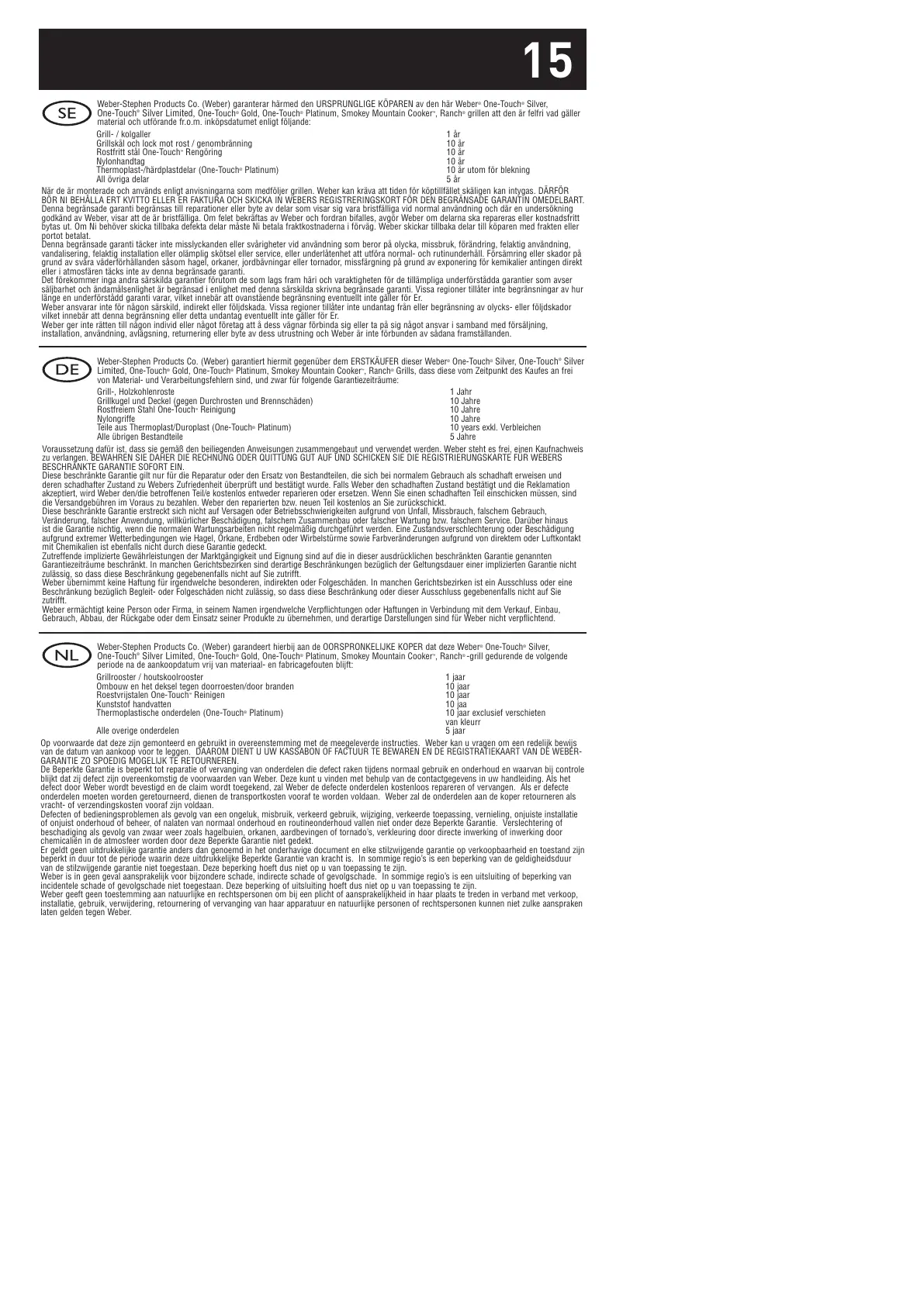Weber-Stephen Products Co. (Weber) garandeert hierbij aan de OORSPRONKELIJKE KOPER dat deze Weber