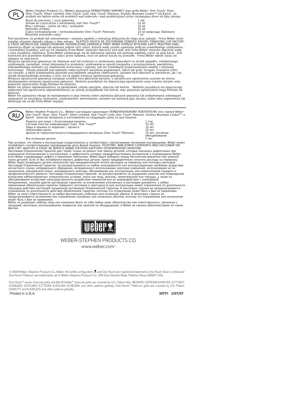 Weber-Stephen Products Co., (Weber) настоящим гарантирует ПЕРВОНАЧАЛЬНОМУ ПОКУПАТЕЛЮ этих грилей Weber