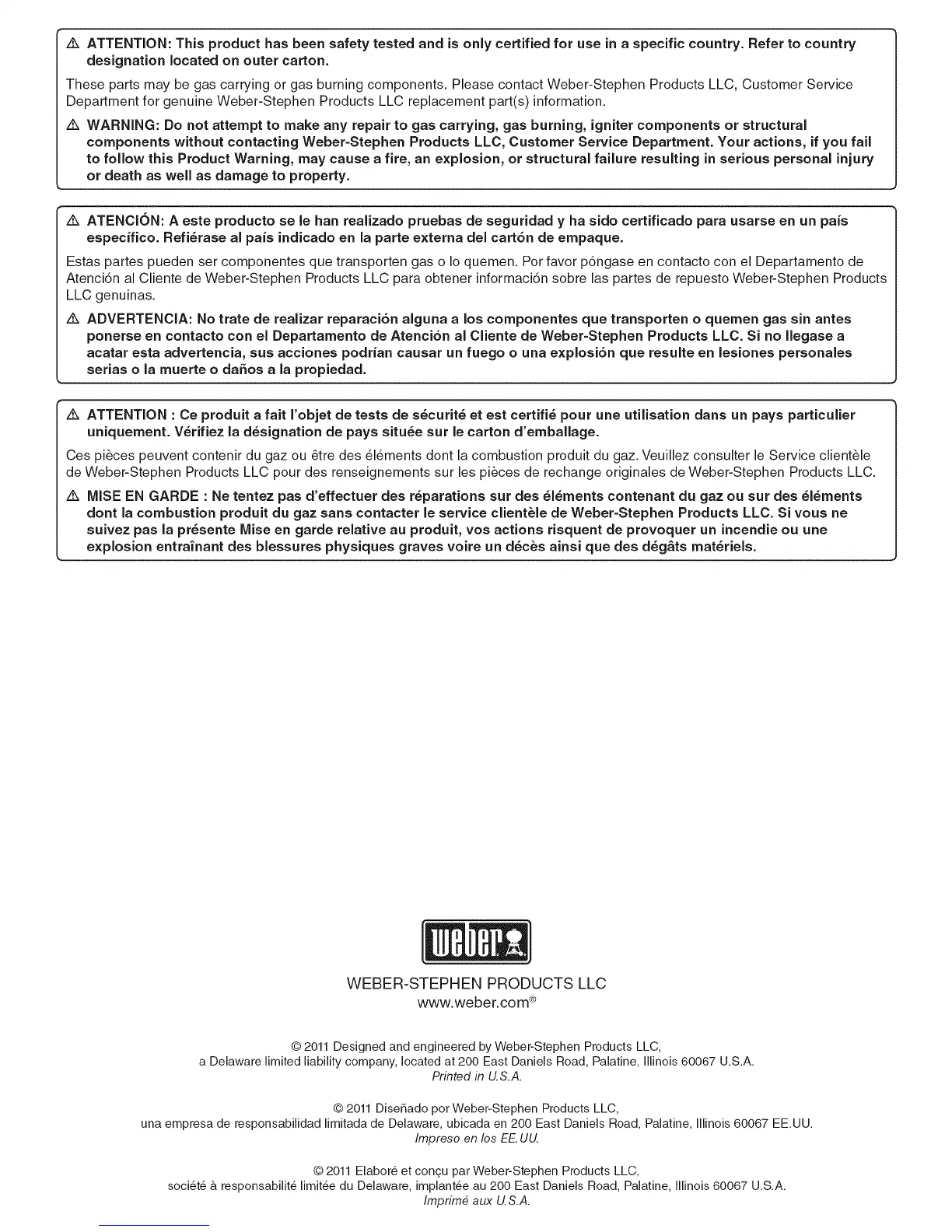 components without contacting Weber=Stephen Products LLC, Customer Service Department. Your actions, if you fail
