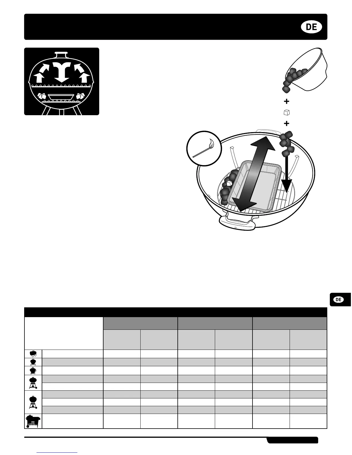 folgende Tabelle) Füllen Sie die empfohlene Menge an Holzkohle