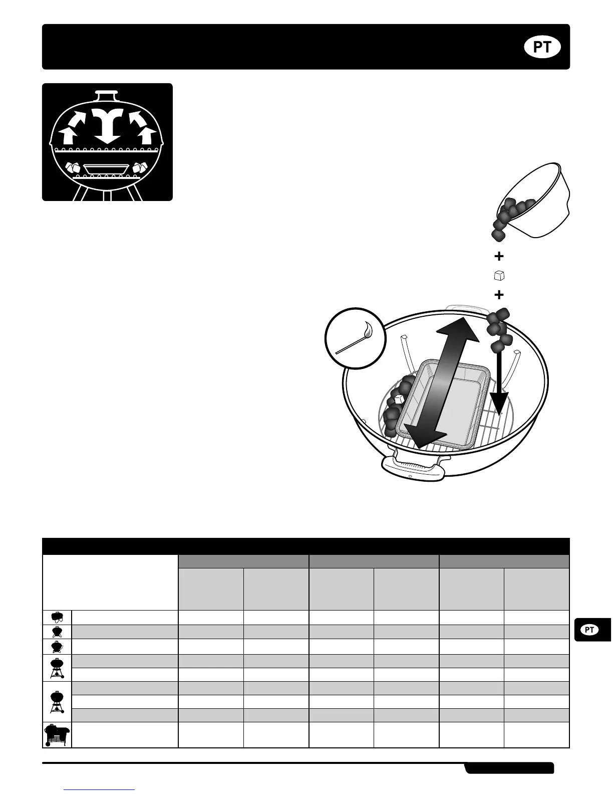 a quantidade adequada de carvão a utilizar (consulte a tabela