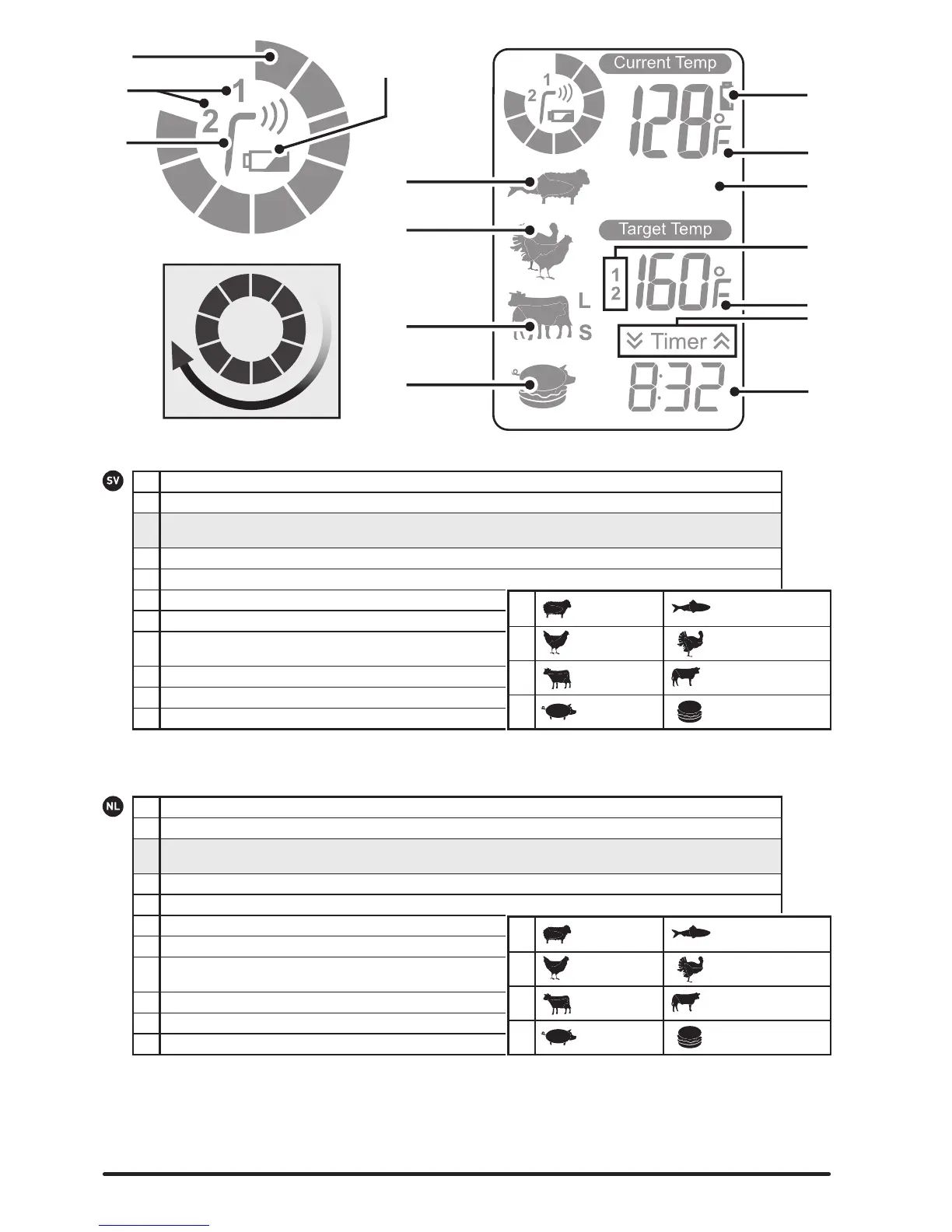 Snabbläsningsfältet visas när matens temperatur stiger och blinkar när måltemperaturen nås. Ett nytt fält