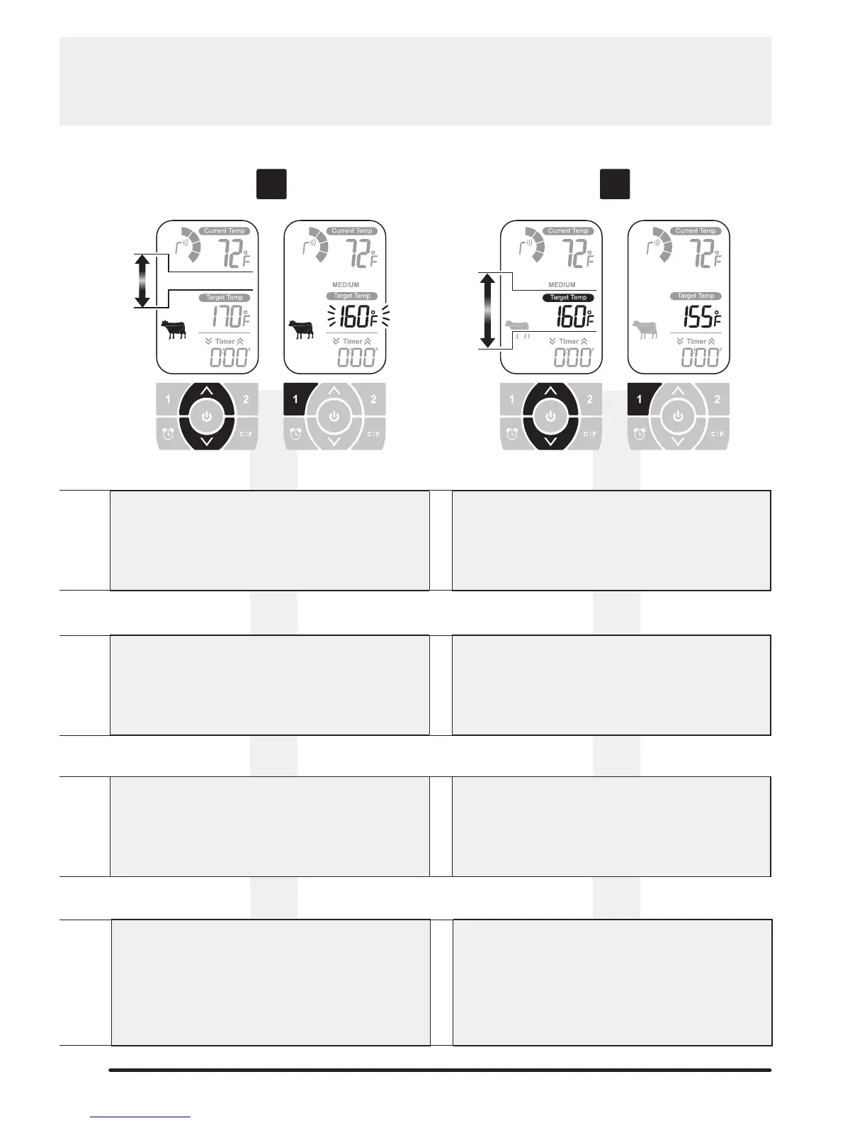 • Stisknutím 1 potvrďte volbu stupně propečení. Teploměr