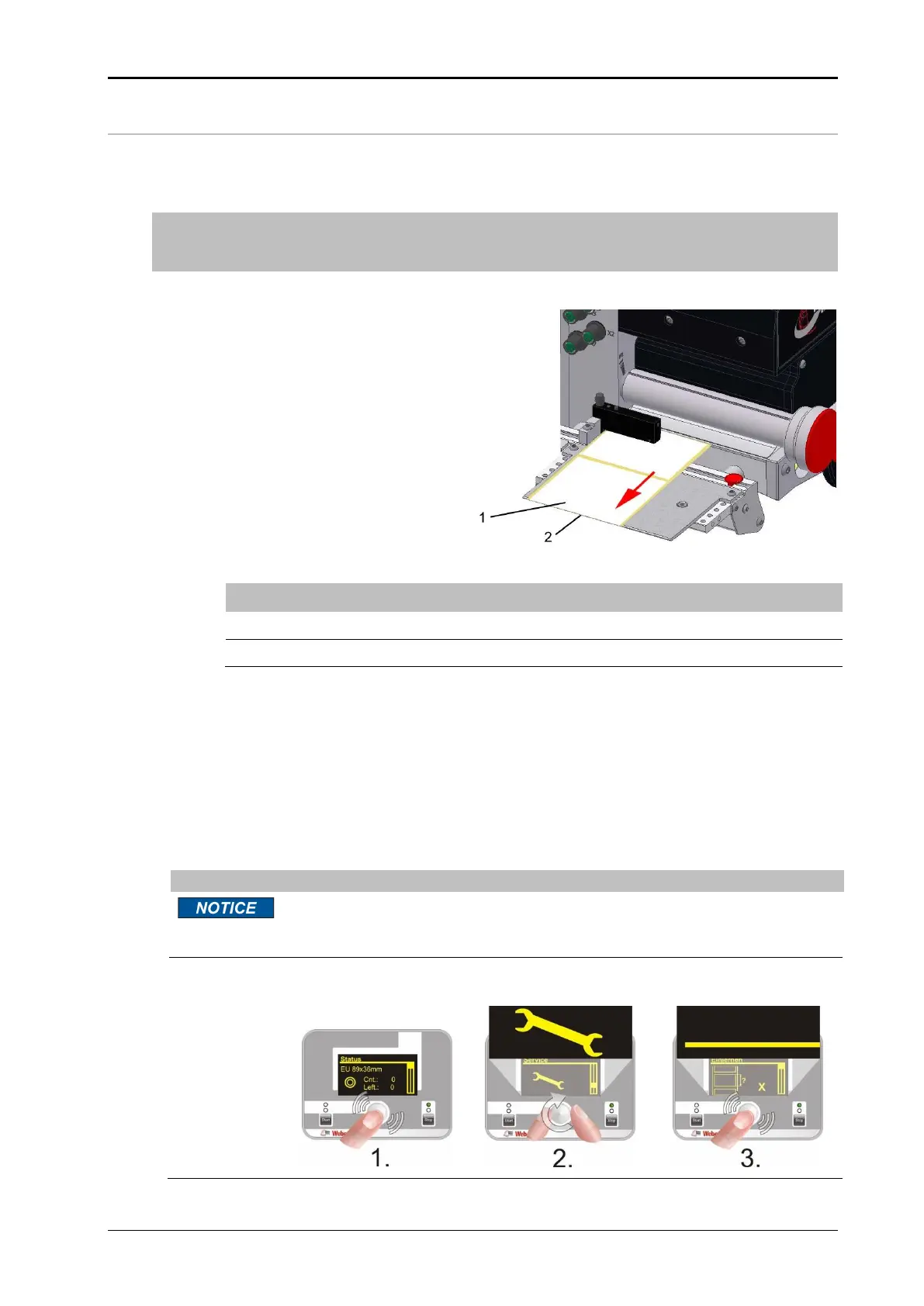label length and the label stop position (the label stops at the dispensing edge). The cali-