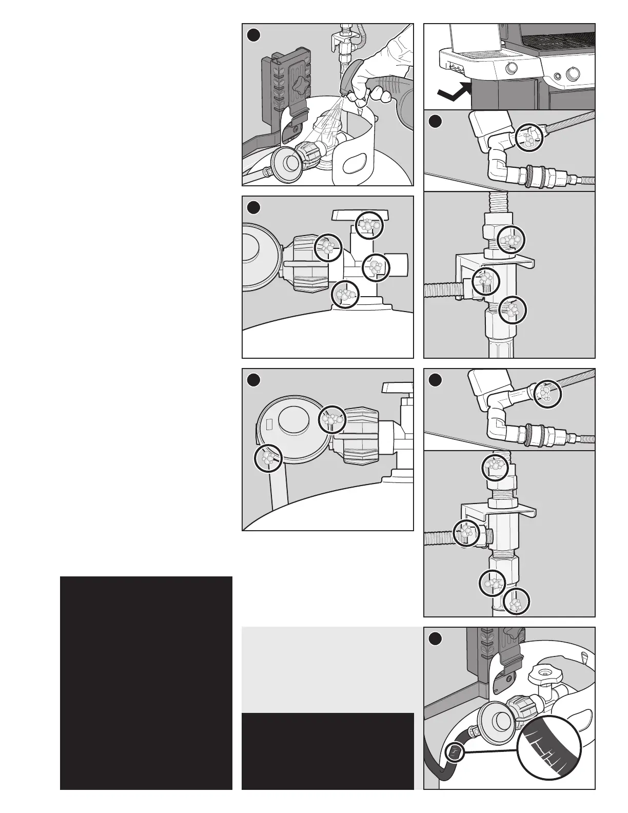 • Where the gas hose connects to the bulkhead.
